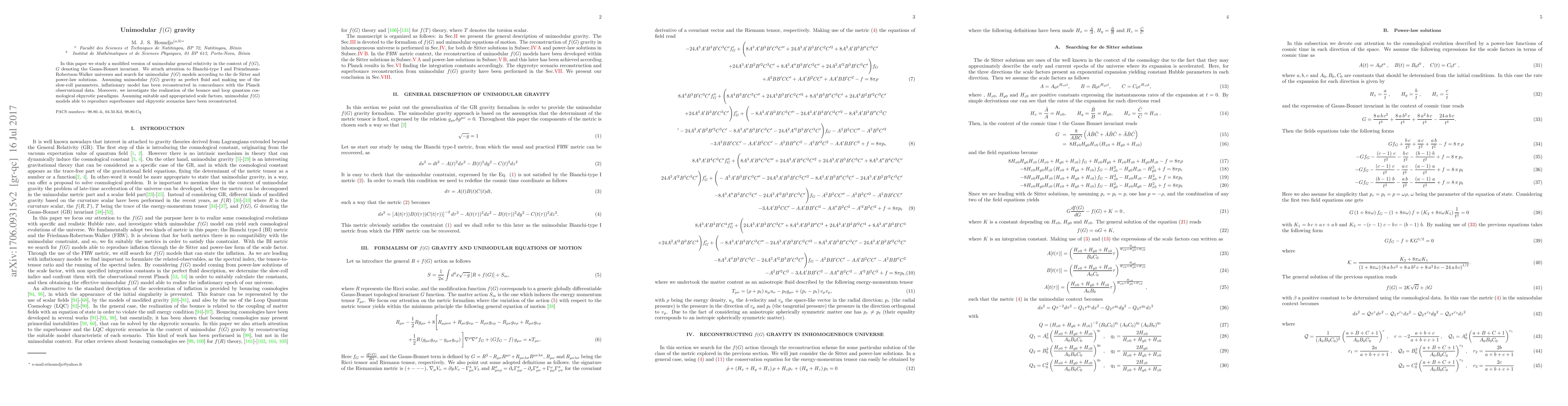 In this paper we study a modified version of unimodular general relativity in the context of $f(G)$, $G$ denoting the Gauss-Bonnet invariant. We attach attention to Bianchi-type I and Friendmann-Robertson-Walker universes and search for unimodular $f(G)$ models according to the de Sitter and power-law solutions. Assuming unimodular $f(G)$ gravity as perfect fluid and making use of the slow-roll parameters, inflationary model has been reconstructed in concordance with the Planck observational data. Moreover, we investigate the realization of the bounce and loop quantum cosmological ekpyrotic paradigms. Assuming suitable and appropriated scale factors, unimodular $f(G)$ models able to reproduce superbounce and ekpyrotic scenarios have been reconstructed.
