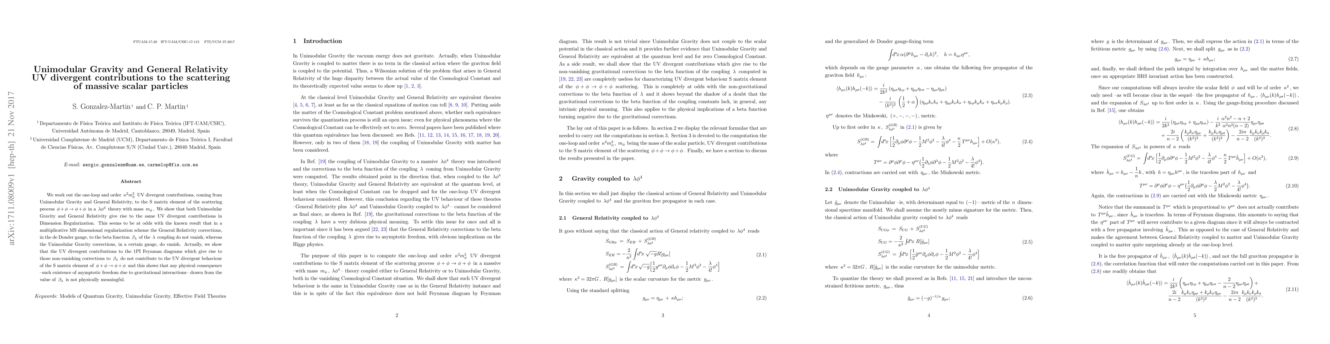 This study investigates the scattering of massive scalar particles in a specific theory, finding that Unimodular Gravity and General Relativity produce identical UV divergent contributions to the S matrix element, rendering any physical consequences related to gravitational interactions irrelevant.