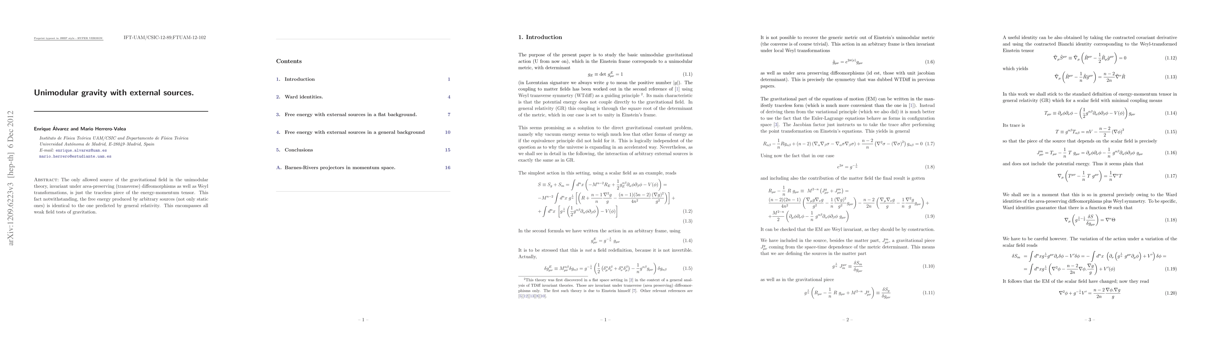 The only allowed source of the gravitational field in the unimodular theory, invariant under area-preserving (transverse) diffeomorphisms as well as Weyl transformations, is just the traceless piece of the energy-momentum tensor. This fact notwithstanding, the free energy produced by arbitrary sources (not only static ones) is identical to the one predicted by general relativity. This encompasses all weak field tests of gravitation.