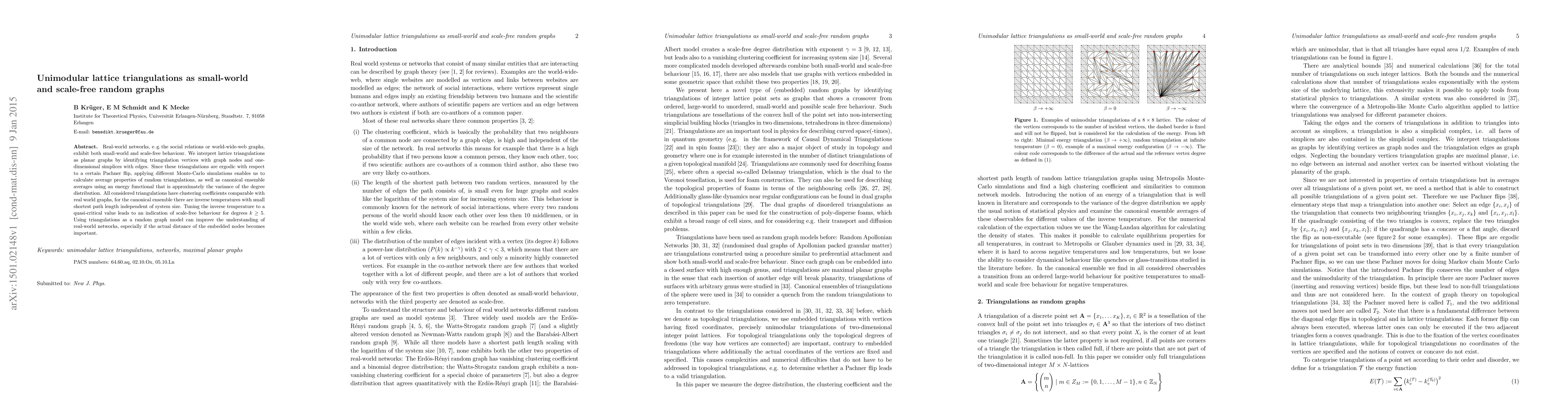 This paper explores unimodular lattice triangulations as a model for small-world and scale-free random graphs, demonstrating that these triangulations exhibit clustering coefficients and shortest path lengths similar to real-world networks and indicating scale-free behavior at certain parameters. The study uses Monte-Carlo simulations to analyze average properties of these triangulations.