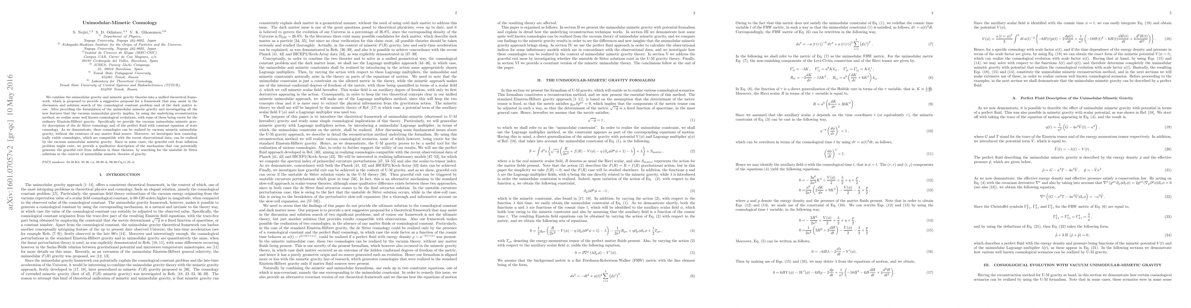 This paper proposes a unified framework combining unimodular and mimetic gravity to address the cosmological constant problem and dark matter issue. It demonstrates how vacuum unimodular mimetic gravity can realize de Sitter and perfect fluid cosmologies without matter sources, and explores its potential for generating a graceful exit from inflation.