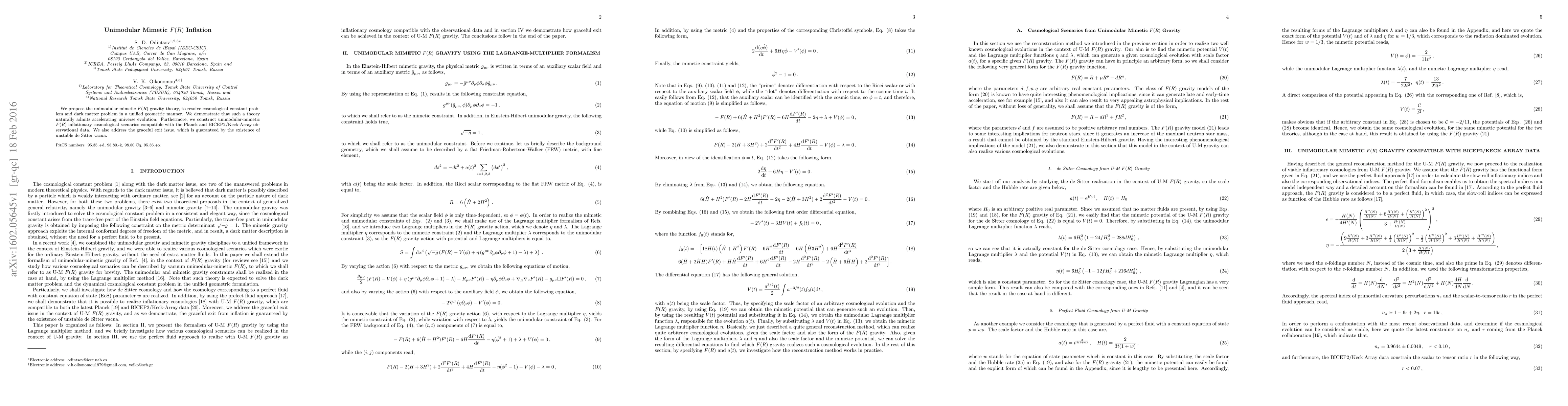 We propose the unimodular-mimetic $F(R)$ gravity theory, to resolve cosmological constant problem and dark matter problem in a unified geometric manner. We demonstrate that such a theory naturally admits accelerating universe evolution. Furthermore, we construct unimodular-mimetic $F(R)$ inflationary cosmological scenarios compatible with the Planck and BICEP2/Keck-Array observational data. We also address the graceful exit issue, which is guaranteed by the existence of unstable de Sitter vacua.