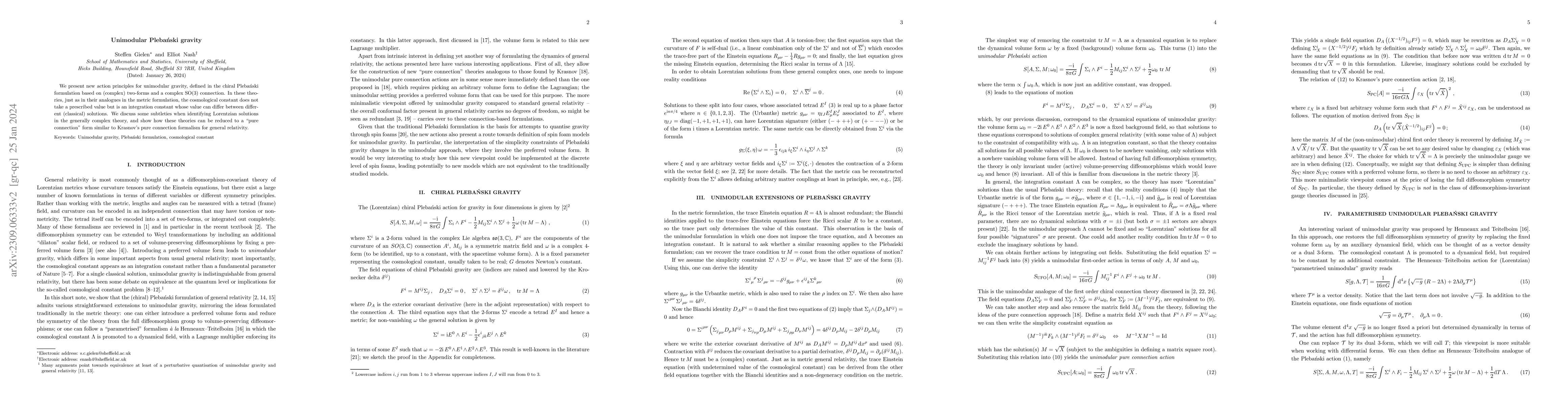 This paper introduces new action principles for unimodular Plebański gravity based on complex two-forms and an ${\rm SO}(3)$ connection, allowing the cosmological constant to vary between solutions. It also explores the reduction of these theories to a "pure connection" form akin to Krasnov's formalism for general relativity.