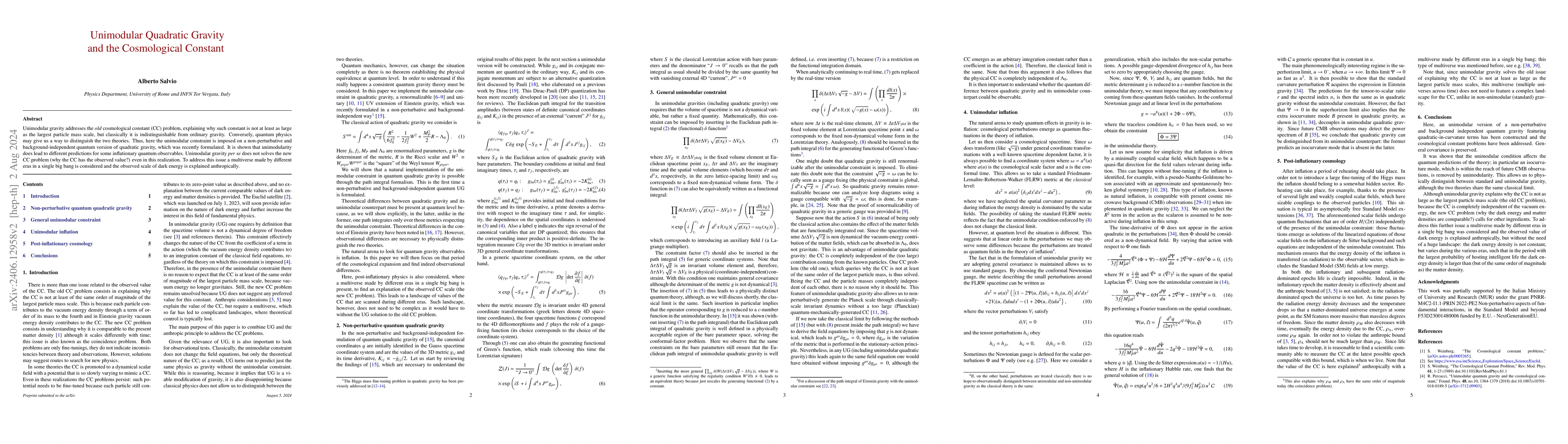 Unimodular quadratic gravity offers a distinct approach to address the cosmological constant problem by imposing a unimodular constraint, showing it leads to different predictions for inflationary observables but does not resolve why the cosmological constant has its observed value. A multiverse scenario is proposed to anthropically explain the observed dark energy scale.