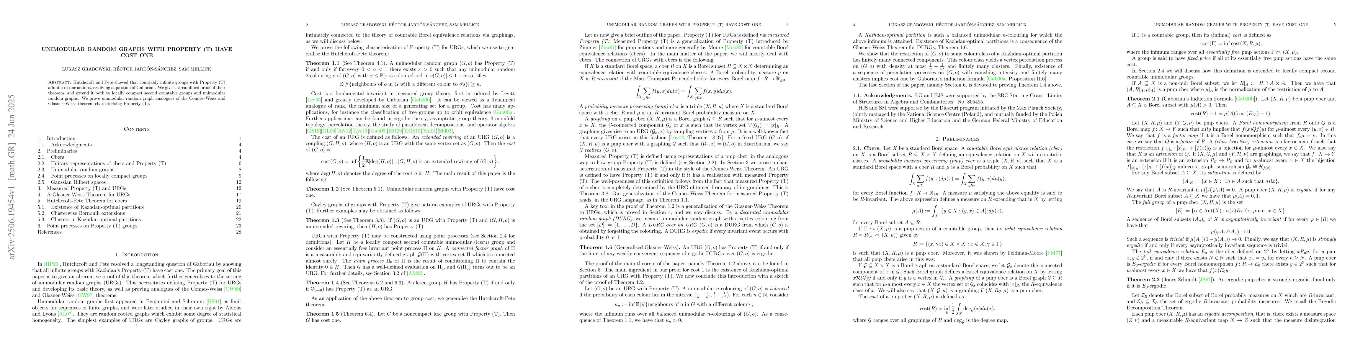 Hutchcroft and Pete showed that countably infinite groups with Property (T) admit cost one actions, resolving a question of Gaboriau. We give a streamlined proof of their theorem, and extend it both to locally compact second countable groups and unimodular random graphs. We prove unimodular random graph analogues of the Connes--Weiss and Glasner--Weiss theorem characterising Property (T).