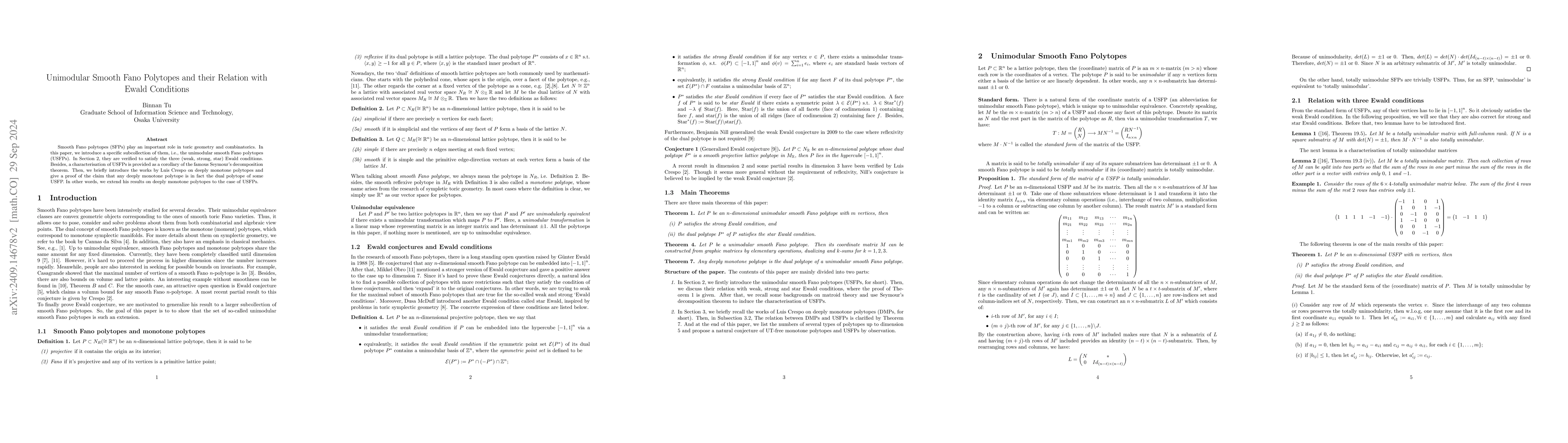 This paper investigates unimodular smooth Fano polytopes (USFP), a specific subset of smooth Fano polytopes, demonstrating their compliance with the Ewald conditions and linking them to deeply monotone polytopes through Seymour's decomposition theorem. It concludes with a proof that any deeply monotone polytope is the dual of a USFP.