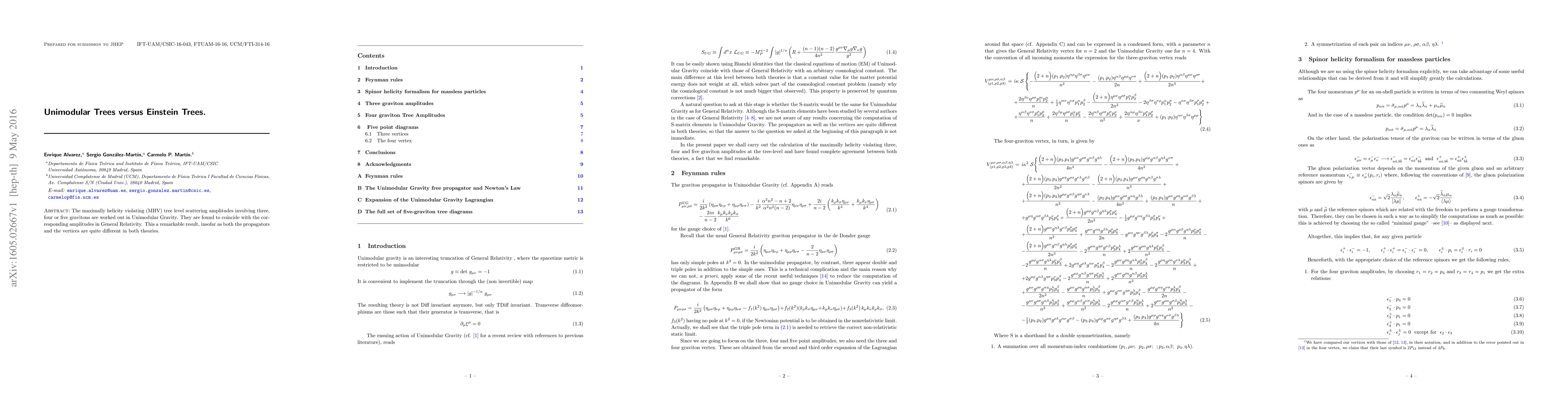 The maximally helicity violating (MHV) tree level scattering amplitudes involving three, four or five gravitons are worked out in Unimodular Gravity. They are found to coincide with the corresponding amplitudes in General Relativity. This a remarkable result, insofar as both the propagators and the vertices are quite different in both theories.