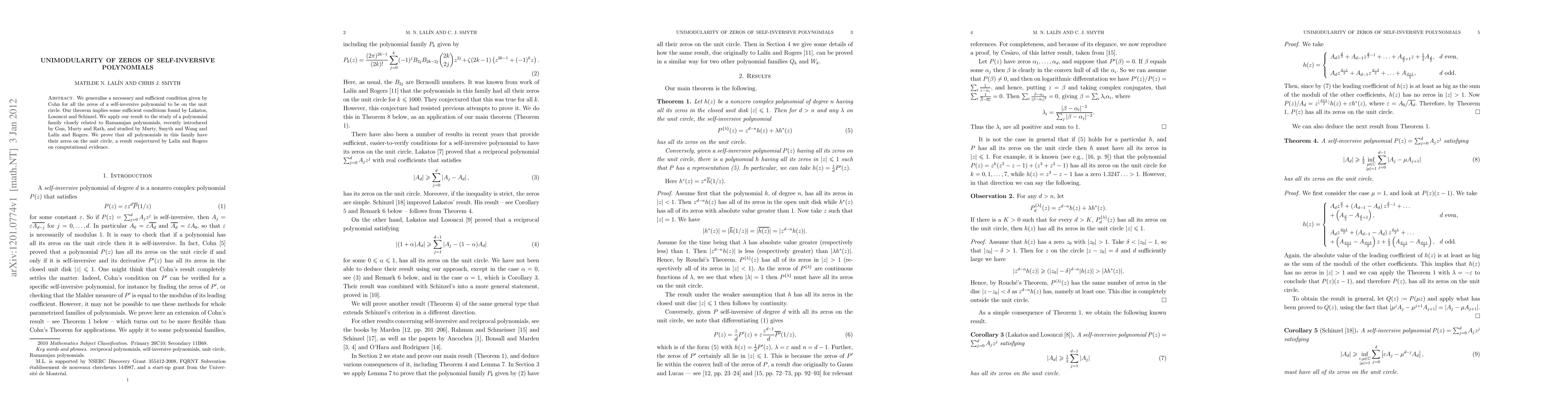 This research paper proves a general condition for zeros of self-inversive polynomials to be on the unit circle, with implications for a specific polynomial family related to Ramanujan polynomials, resolving a conjecture by Lal'in and Rogers.