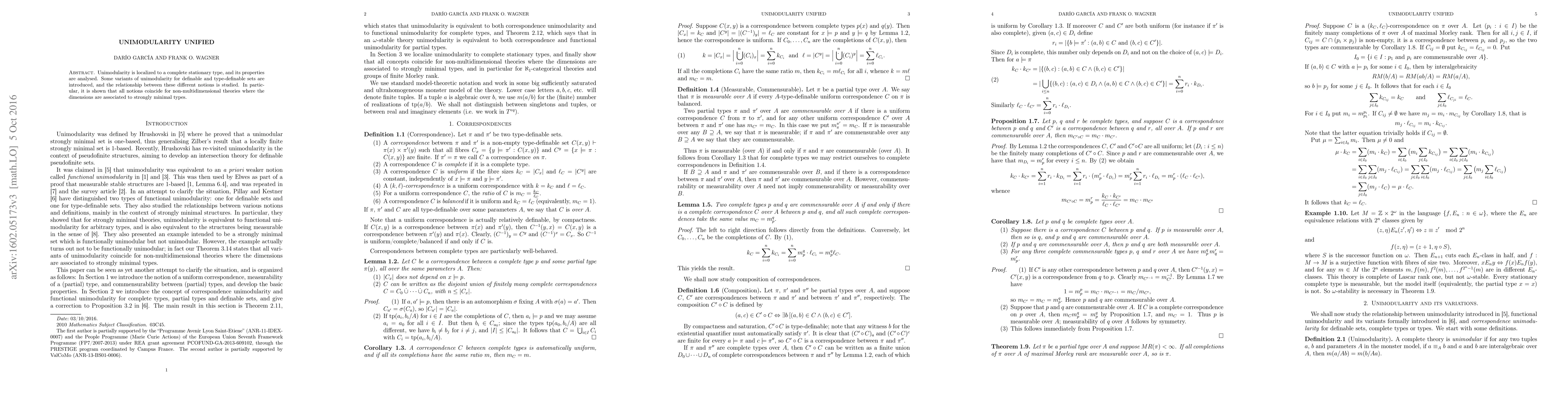 Unimodularity is analyzed within the context of complete stationary types, and various forms for definable and type-definable sets are introduced. It is demonstrated that these notions converge for non-multidimensional theories linked to strongly minimal types.