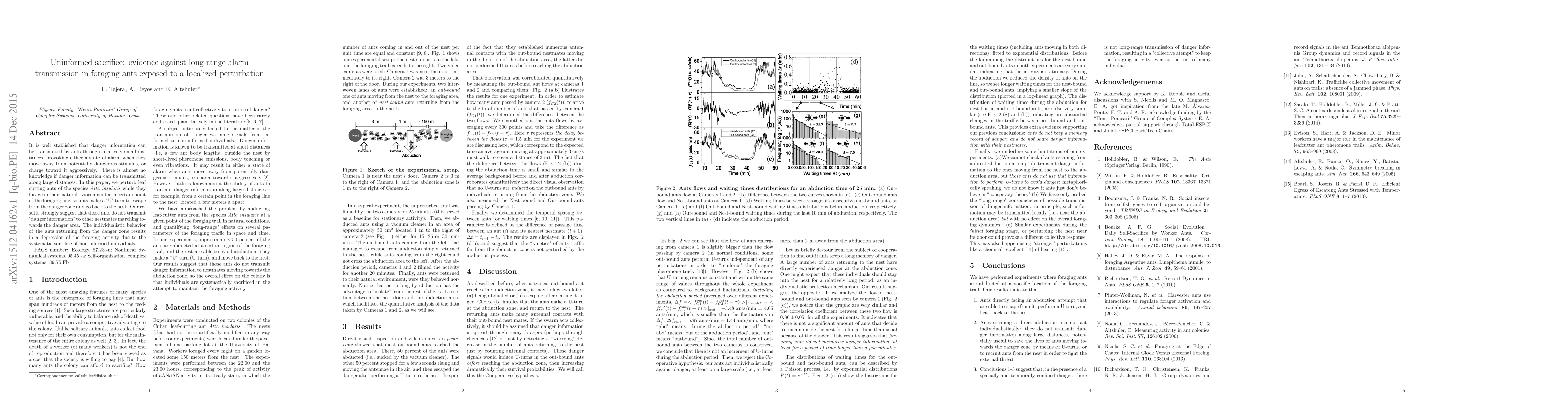This study investigates whether leaf-cutting ants transmit danger signals over long distances. Experiments show that ants escaping a localized threat do not inform oncoming foragers, leading to uninformed sacrifice and reduced foraging activity.
