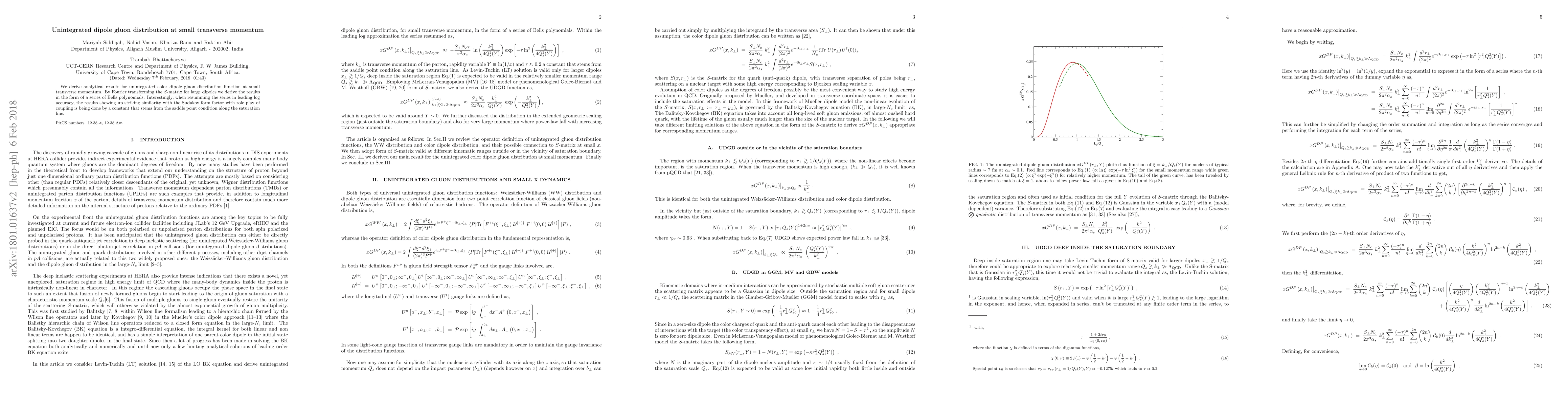 This paper derives analytical results for the unintegrated color dipole gluon distribution at small transverse momentum, expressing them as a series of Bell polynomials. The study finds a striking similarity between the derived results and the Sudakov form factor when the series is resummed in leading log accuracy.