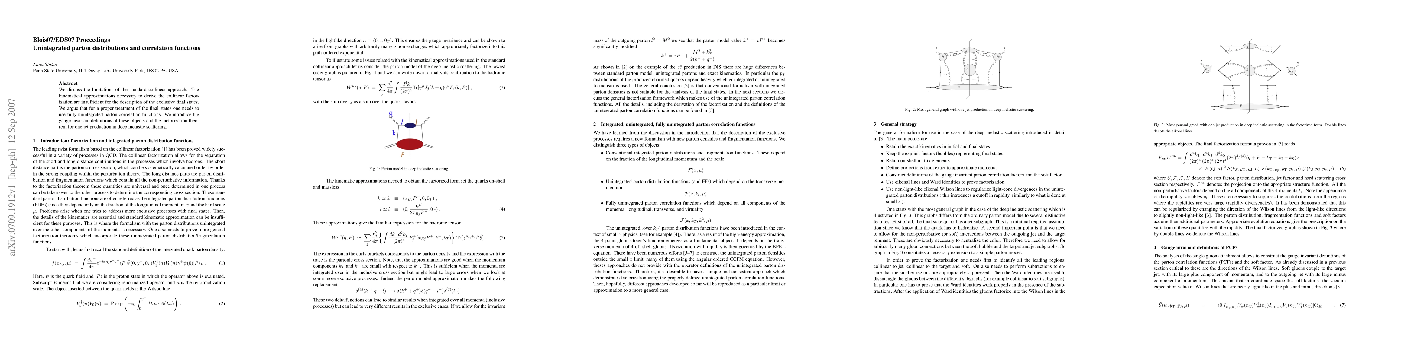 We discuss the limitations of the standard collinear approach. The kinematical approximations necessary to derive the collinear factorization are insufficient for the description of the exclusive final states. We argue that for a proper treatment of the final states one needs to use fully unintegrated parton correlation functions. We introduce the gauge invariant definitions of these objects and the factorization theorem for one jet production in deep inelastic scattering.