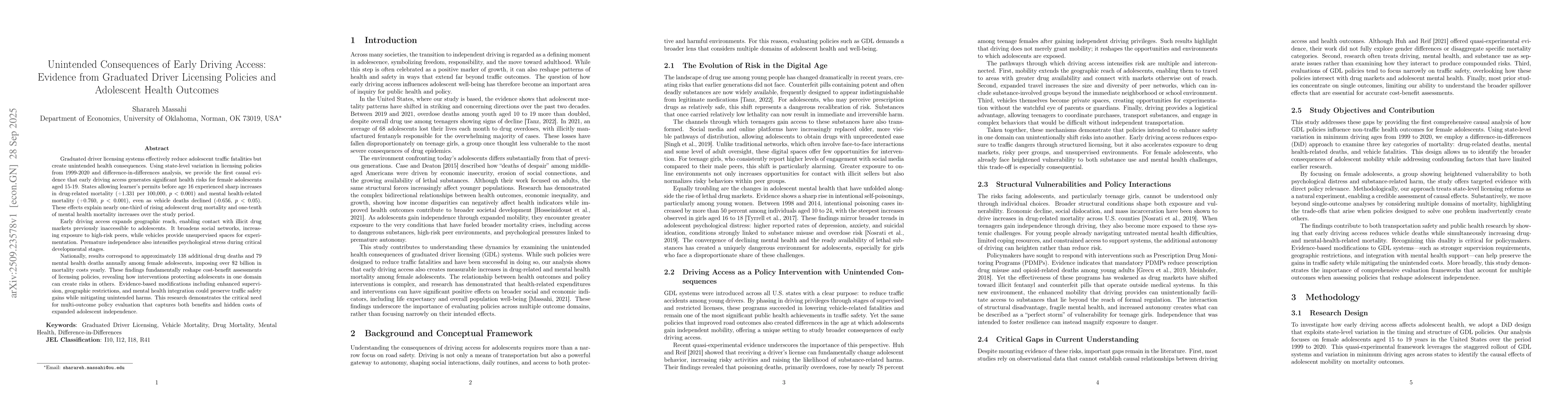 Graduated driver licensing systems effectively reduce adolescent traffic fatalities but create unintended health consequences. Using state-level variation in licensing policies from 1999-2020 and difference-in-differences analysis, we provide the first causal evidence that early driving access generates significant health risks for female adolescents aged 15-19. States allowing learner's permits before age 16 experienced sharp increases in drug-related mortality (+1.331 per 100,000, p<0.001) and mental health-related mortality (+0.760, p<0.001), even as vehicle deaths declined (-0.656, p<0.05). These effects explain nearly one-third of rising adolescent drug mortality and one-tenth of mental health mortality increases over the study period. Early driving access expands geographic reach, enabling contact with illicit drug markets previously inaccessible to adolescents. It broadens social networks, increasing exposure to high-risk peers, while vehicles provide unsupervised spaces for experimentation. Premature independence also intensifies psychological stress during critical developmental stages. Nationally, results correspond to approximately 138 additional drug deaths and 79 mental health deaths annually among female adolescents, imposing over $2 billion in mortality costs yearly. These findings fundamentally reshape cost-benefit assessments of licensing policies, revealing how interventions protecting adolescents in one domain can create risks in others. Evidence-based modifications including enhanced supervision, geographic restrictions, and mental health integration could preserve traffic safety gains while mitigating unintended harms. This research demonstrates the critical need for multi-outcome policy evaluation that captures both benefits and hidden costs of expanded adolescent independence.