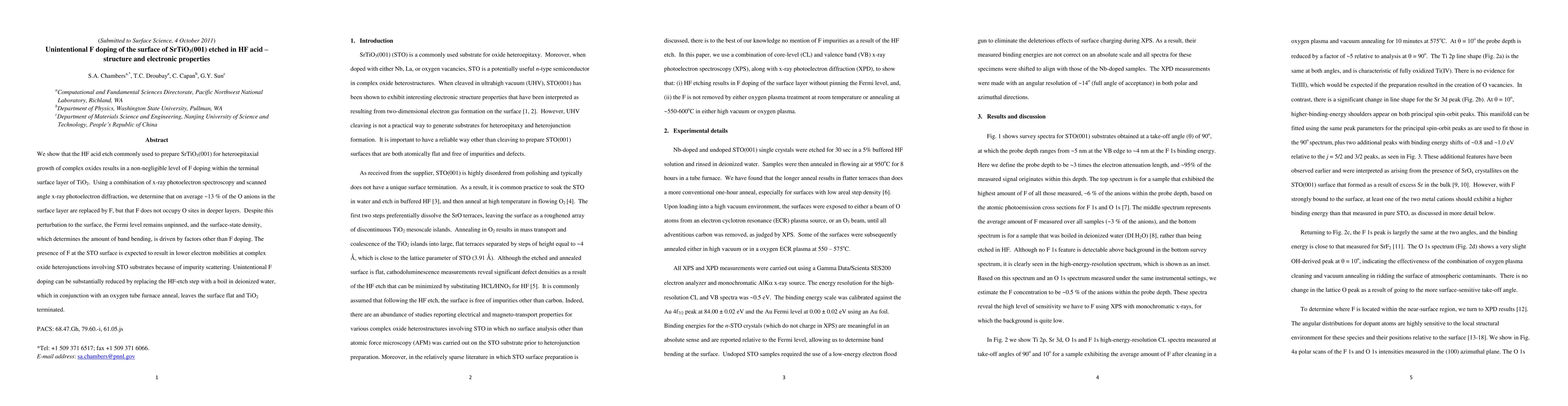 This study investigates the unintended fluorine (F) doping in the surface layer of SrTiO3(001) after HF acid etching, revealing ~13% substitution of oxygen (O) by F. Despite this doping, the Fermi level remains unaffected, and the surface-state density is not primarily influenced by F. The presence of F is expected to reduce electron mobility in complex oxide heterojunctions due to impurity scattering. Reducing F doping can be achieved by using deionized water instead of HF acid followed by an oxygen tube furnace anneal.