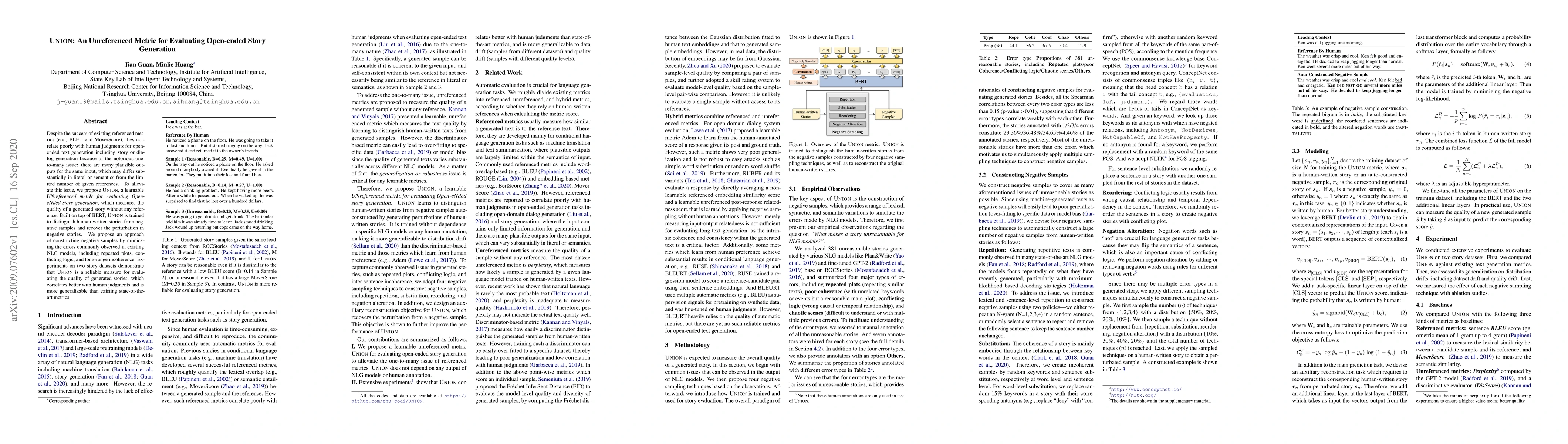 The paper proposes UNION, a novel unreferenced metric for evaluating open-ended story generation, which outperforms existing referenced metrics by measuring the quality of stories without any reference. UNION, built on BERT, is trained to distinguish human-written stories from perturbed negative samples, showing better correlation with human judgments and higher generalizability.