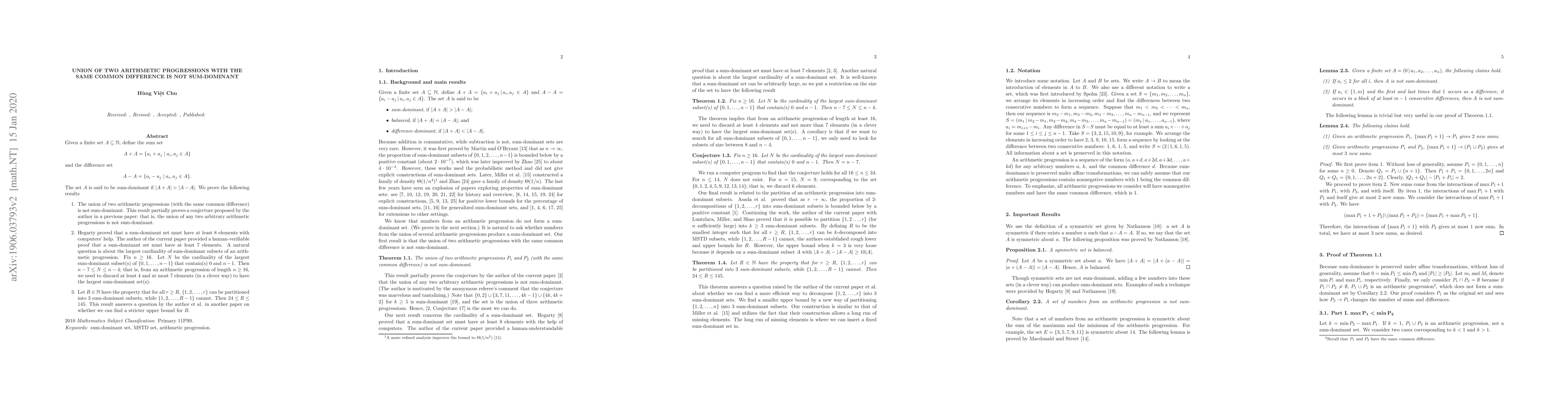 Given a finite set $A\subseteq \mathbb{N}$, define the sum set $$A+A = \{a_i+a_j\mid a_i,a_j\in A\}$$ and the difference set $$A-A = \{a_i-a_j\mid a_i,a_j\in A\}.$$ The set $A$ is said to be sum-dominant if $|A+A|>|A-A|$. We prove the following results. 1) The union of two arithmetic progressions (with the same common difference) is not sum-dominant. This result partially proves a conjecture proposed by the author in a previous paper; that is, the union of any two arbitrary arithmetic progressions is not sum-dominant. 2) Hegarty proved that a sum-dominant set must have at least $8$ elements with computers' help. The author of the current paper provided a human-verifiable proof that a sum-dominant set must have at least $7$ elements. A natural question is about the largest cardinality of sum-dominant subsets of an arithmetic progression. Fix $n\ge 16$. Let $N$ be the cardinality of the largest sum-dominant subset(s) of $\{0,1,\ldots,n-1\}$ that contain(s) $0$ and $n-1$. Then $n-7\le N\le n-4$; that is, from an arithmetic progression of length $n\ge 16$, we need to discard at least $4$ and at most $7$ elements (in a clever way) to have the largest sum-dominant set(s). 3) Let $R\in \mathbb{N}$ have the property that for all $r\ge R$, $\{1,2,\ldots,r\}$ can be partitioned into $3$ sum-dominant subsets, while $\{1,2,\ldots,R-1\}$ cannot. Then $24\le R\le 145$. This result answers a question by the author et al. in another paper on whether we can find a stricter upper bound for $R$.