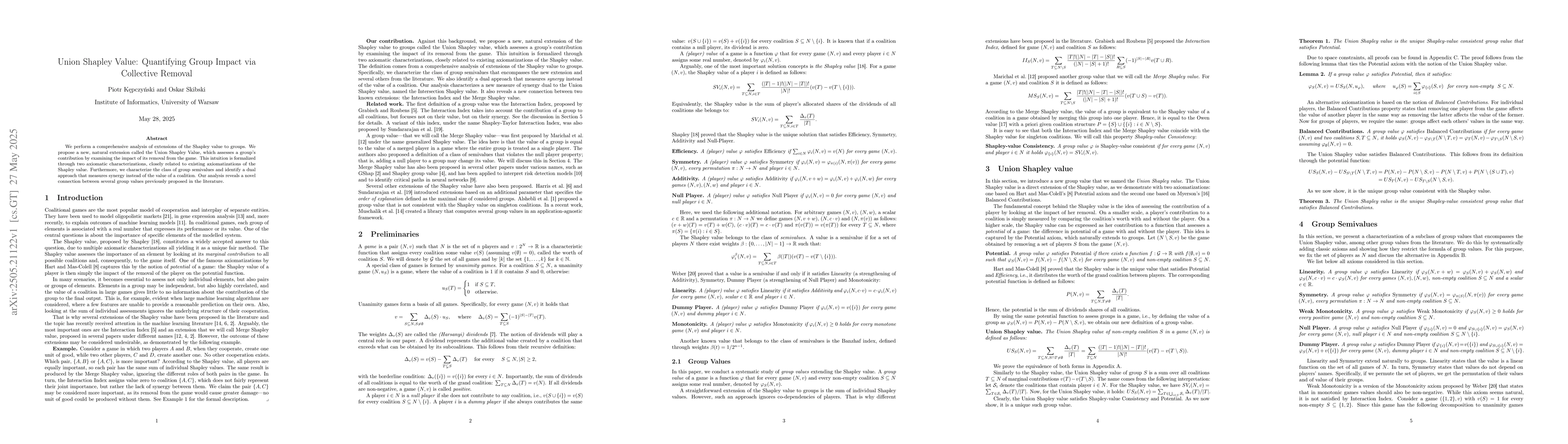 The research proposes a new group extension of the Shapley value called Union Shapley Value, characterized axiomatically and contrasted with existing axiomatizations.