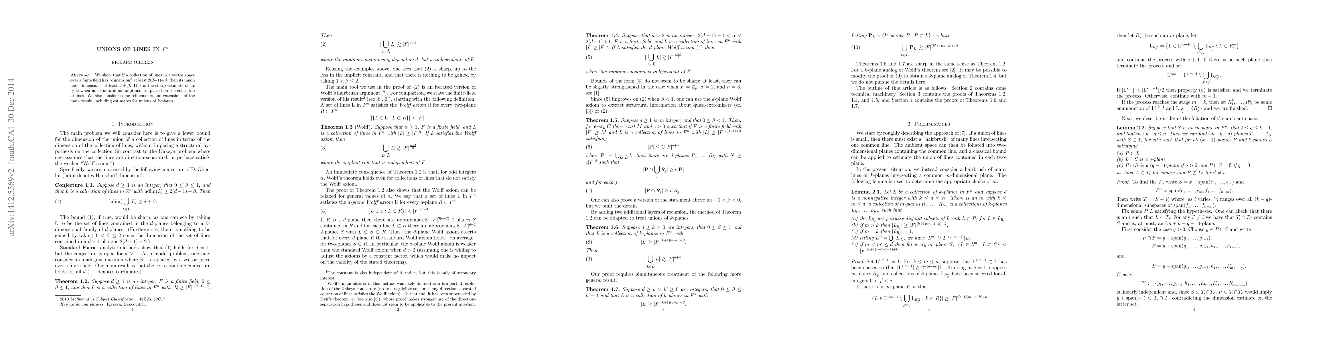 We show that if a collection of lines in a vector space over a finite field has "dimension" at least 2(d-1) + beta, then its union has "dimension" at least d + beta. This is the sharp estimate of its type when no structural assumptions are placed on the collection of lines. We also consider some refinements and extensions of the main result, including estimates for unions of k-planes.