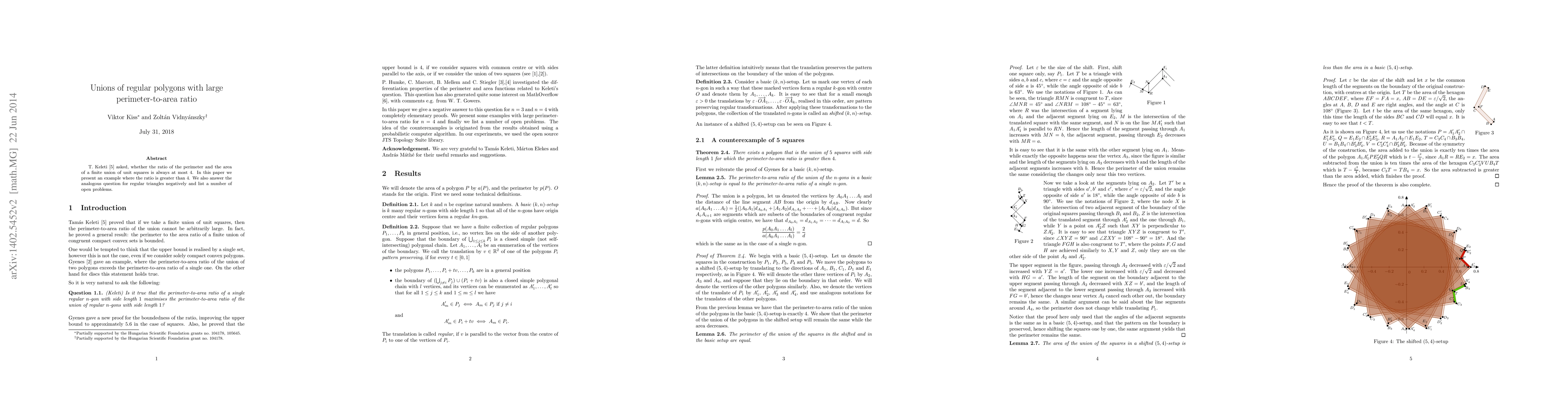 Researchers found an example of a union of regular polygons with a perimeter-to-area ratio greater than 4, answering Keleti's question negatively for regular triangles.