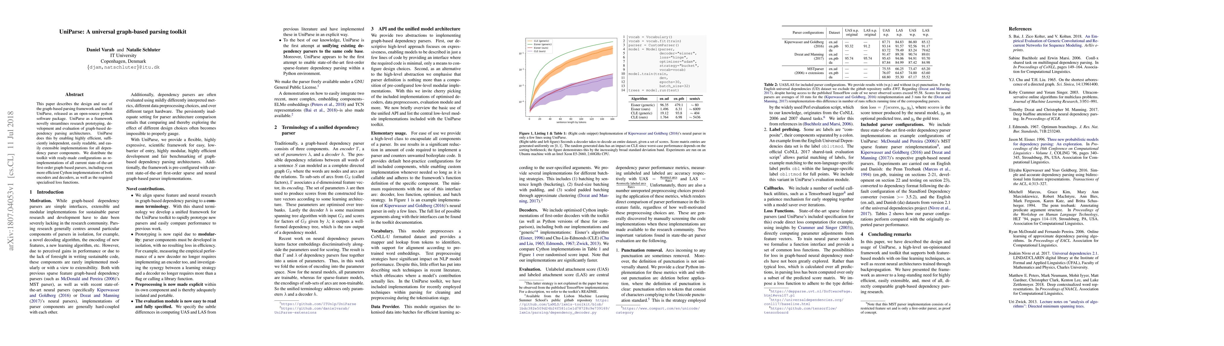 UniParse is a graph-based parsing toolkit that streamlines research prototyping and development of dependency parsing architectures, offering efficient and extensible implementations for various parser components.