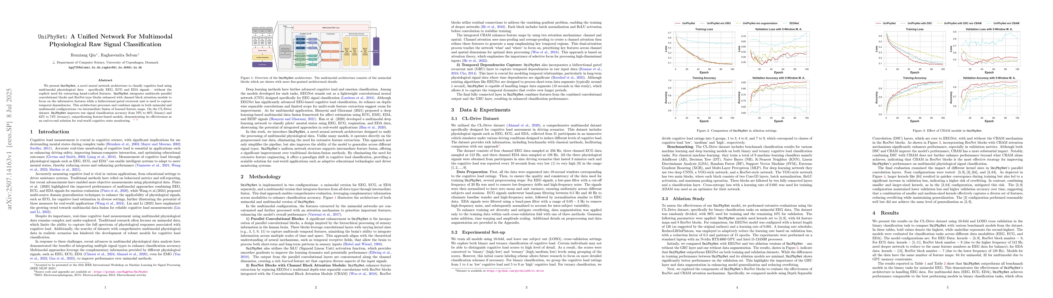 We present UniPhyNet, a novel neural network architecture to classify cognitive load using multimodal physiological data -- specifically EEG, ECG and EDA signals -- without the explicit need for extracting hand-crafted features. UniPhyNet integrates multiscale parallel convolutional blocks and ResNet-type blocks enhanced with channel block attention module to focus on the informative features while a bidirectional gated recurrent unit is used to capture temporal dependencies. This architecture processes and combines signals in both unimodal and multimodal configurations via intermediate fusion of learned feature maps. On the CL-Drive dataset, UniPhyNet improves raw signal classification accuracy from 70% to 80% (binary) and 62% to 74% (ternary), outperforming feature-based models, demonstrating its effectiveness as an end-to-end solution for real-world cognitive state monitoring.