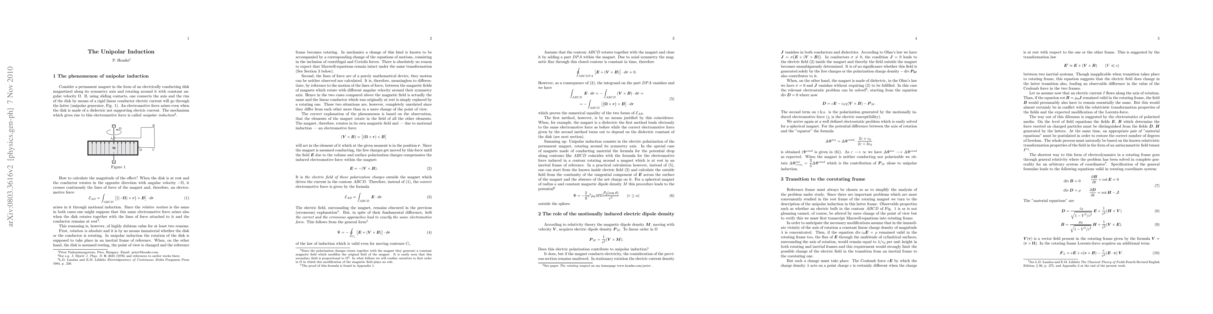 The phenomenon of unipolar induction consists in generating electric field by uniformly rotating permanent magnets made of either conducting or dielectric substance. The origin of the field around conducting magnets is explained and calculated in Sect. 1. Dielectrics are considered in Sect. 2, where the role of the electric moment due to moving magnetic dipole moment is clarified. Sect. 3 is devoted to the description of the effect in the corotating frame of reference. In Sect. 4 the theory is applied to the Earth core and it is shown that the calculated electric field falls precisely into the range of the ambient electric field observed in the Tethered Satellite System mission of NASA. In the last paragraph I reflect on whether flyby anomaly might be attributed to an electric effect.