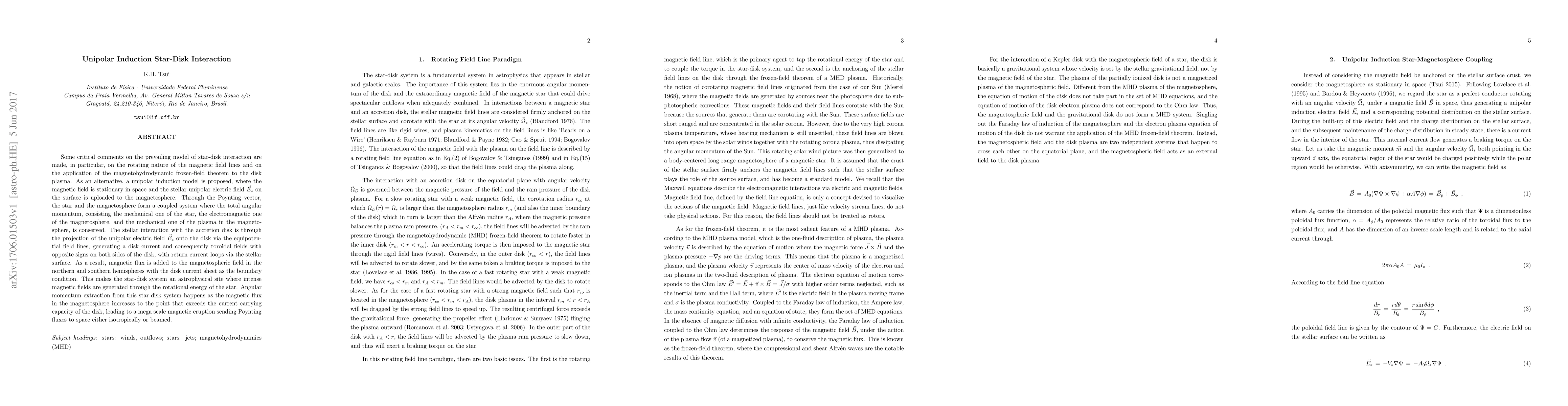 This paper critiques the traditional star-disk interaction model, proposing a unipolar induction model instead. In this model, a stationary magnetic field exists, and the star's electric field is transferred to the magnetosphere, conserving total angular momentum. The star interacts with the accretion disk via this field, generating intense magnetic fields and potentially causing magnetic eruptions when the magnetic flux overwhelms the disk's capacity.