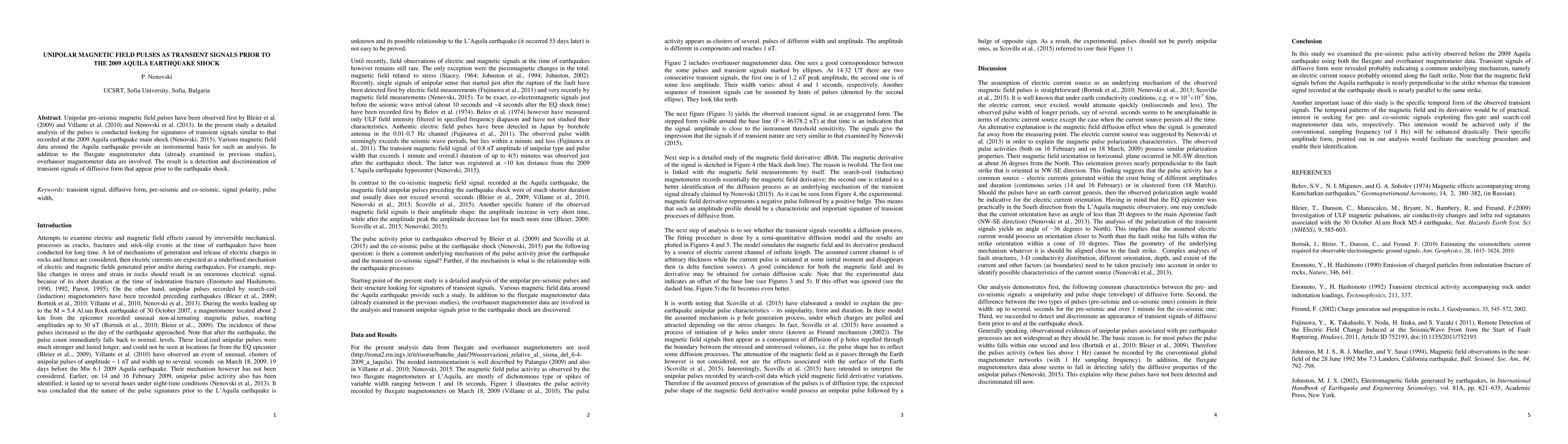 This study analyzes unipolar magnetic field pulses observed prior to the 2009 Aquila earthquake, comparing them to transient signals recorded during the main shock. Utilizing both fluxgate and overhauser magnetometer data, the research identifies diffusive transient signals preceding the earthquake.