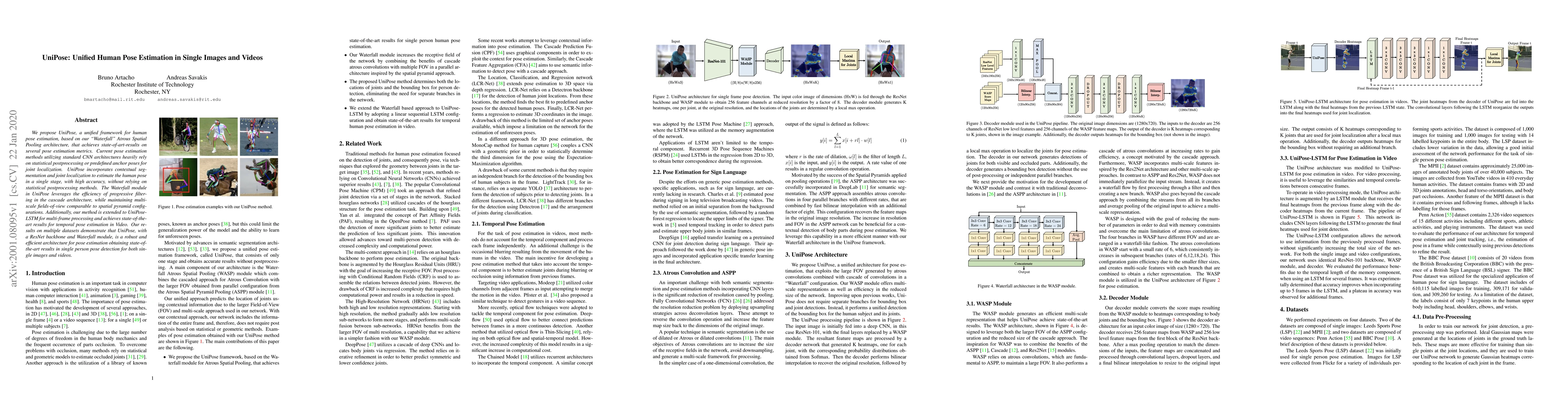 UniPose presents a unified framework for human pose estimation using a "Waterfall" Atrous Spatial Pooling architecture, achieving state-of-the-art results without statistical postprocessing. It extends to UniPose-LSTM for temporal pose estimation in videos, demonstrating robust efficiency and accuracy.