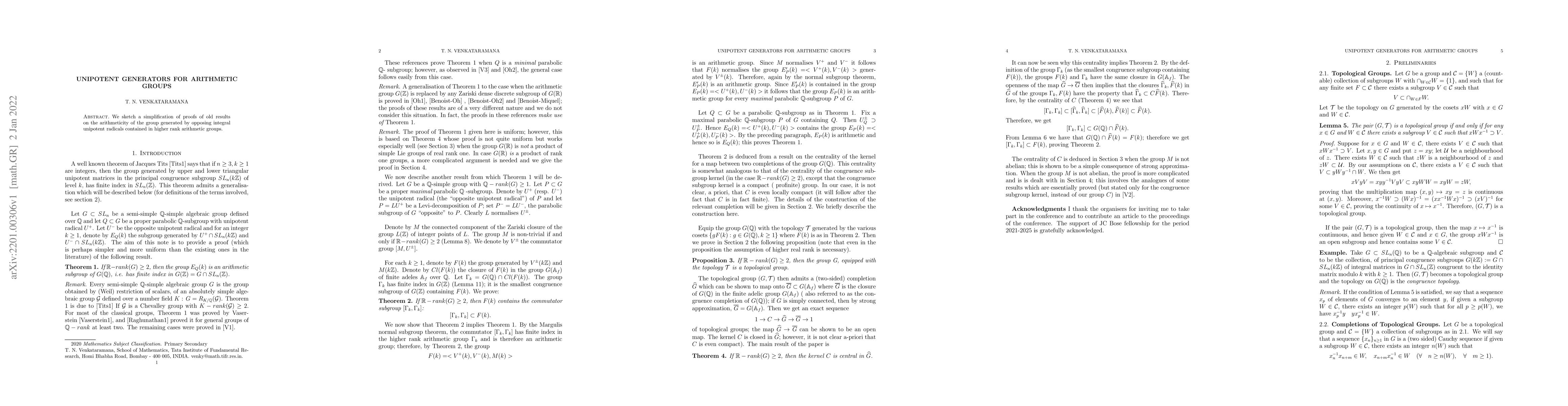 Summary: This paper simplifies proofs for the arithmeticity of groups generated by opposing integral unipotent radicals in higher rank arithmetic groups, focusing on unipotent generators. The approach aims to streamline existing results in the field.