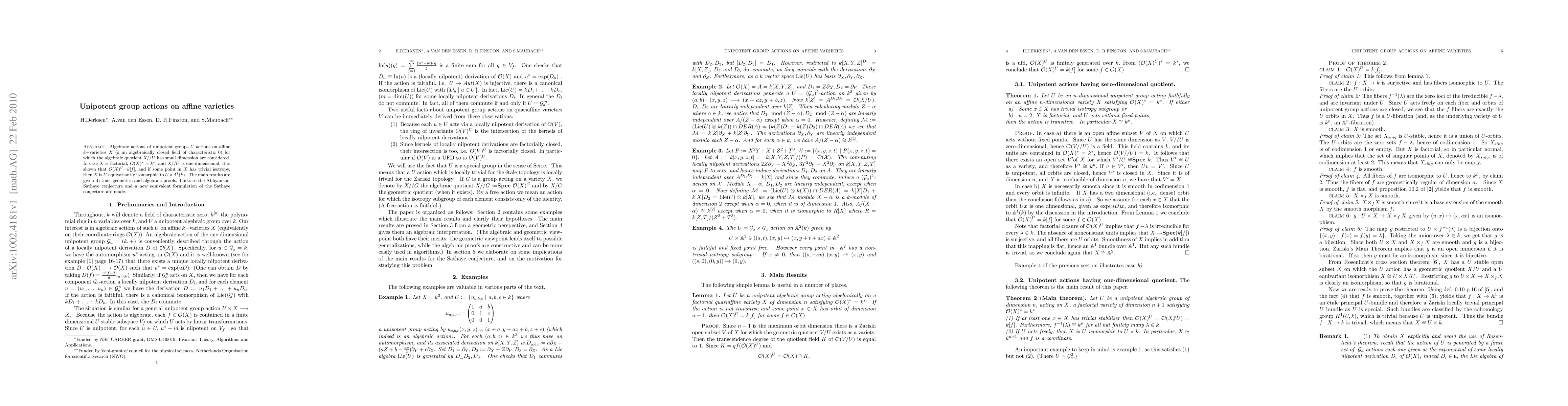 Algebraic actions of unipotent groups $U$ actions on affine $k-$varieties $X$ ($k$ an algebraically closed field of characteristic 0) for which the algebraic quotient $X//U$ has small dimension are considered$.$ In case $X$ is factorial, $O(X)^{\ast}=k^{\ast},$ and $X//U$ is one-dimensional, it is shown that $O(X)^{U}$=$k[f]$, and if some point in $X$ has trivial isotropy, then $X$ is $U$ equivariantly isomorphic to $U\times A^{1}(k).$ The main results are given distinct geometric and algebraic proofs. Links to the Abhyankar-Sathaye conjecture and a new equivalent formulation of the Sathaye conjecture are made.