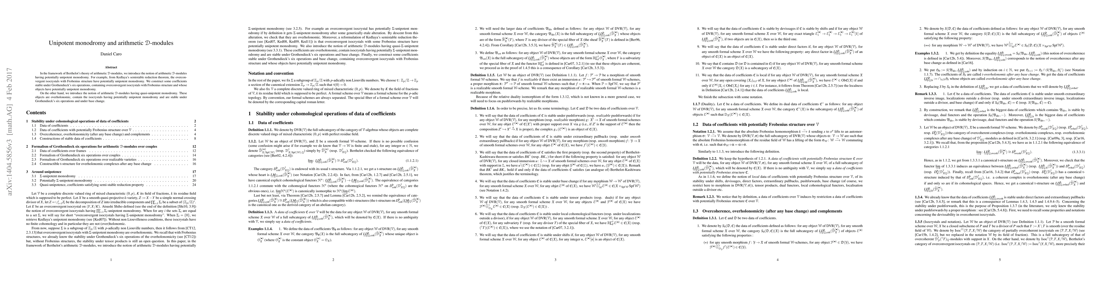 In the framework of Berthelot's theory of arithmetic $\mathcal{D}$-modules, we introduce the notion of arithmetic $\mathcal{D}$-modules having potentially-unipotent monodromy. For example, from Kedlaya's semistable reduction theorem, overconvergent isocrystals with Frobenius structure have potentially unipotent monodromy. We construct some coefficients stable under Grothendieck's six operation, containing overconvergent isocrystals with Frobenius structure and whose object have potentially unipotent monodromy. On the other hand, we introduce the notion of arithmetic $\mathcal{D}$-modules having quasi-unipotent monodromy. These objects are overholonomic, contain the isocrystals having potentially unipotent monodromy and are stable under Grothendieck's six operations and under base change.