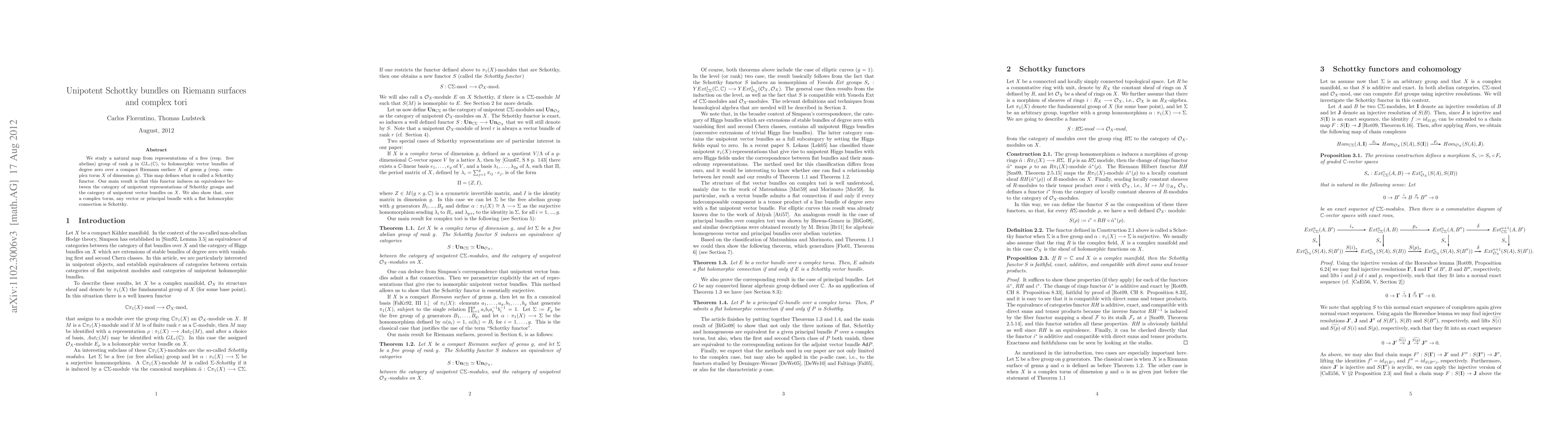 This paper investigates a Schottky functor mapping representations of free groups to holomorphic vector bundles on Riemann surfaces and complex tori, proving an equivalence between unipotent representations of Schottky groups and unipotent vector bundles, and demonstrating that flat holomorphic connections on vector bundles over complex tori are Schottky.
