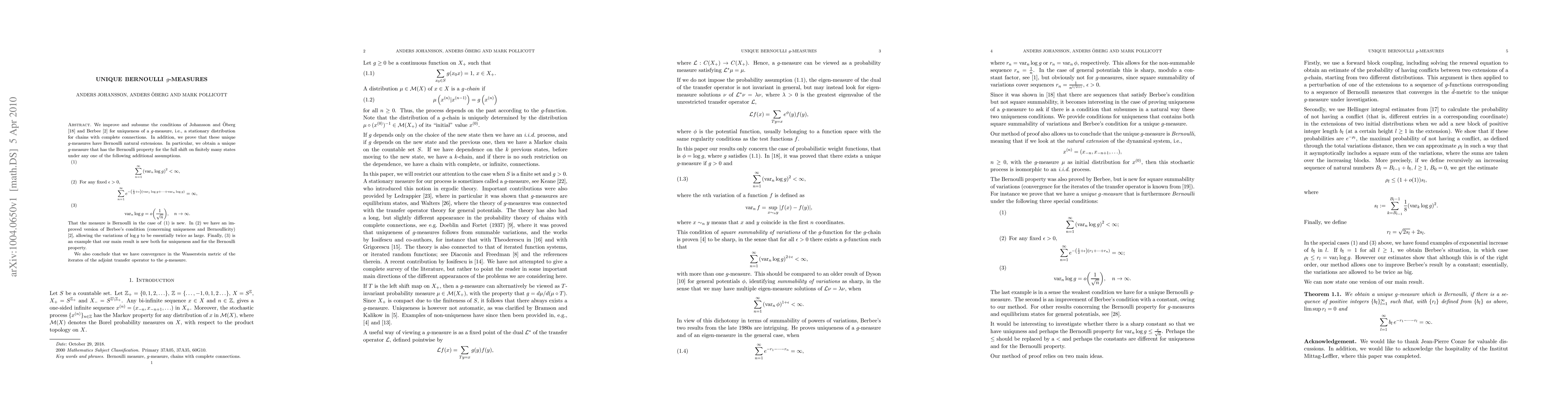 This paper improves conditions for uniqueness of a stationary distribution in chains with complete connections, proving that unique g-measures have Bernoulli natural extensions under specific assumptions.