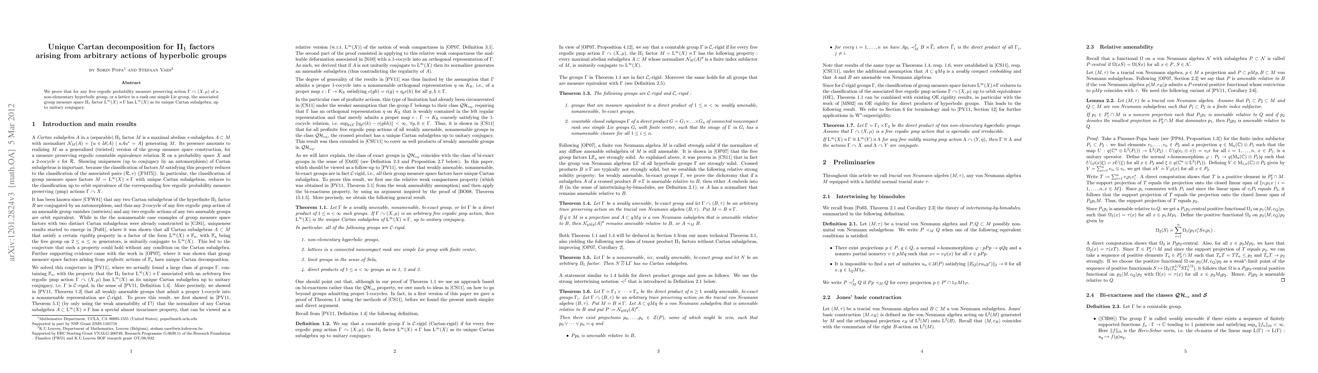 The paper proves that for any free ergodic action of a non-elementary hyperbolic group on a probability space, the II_1 factor generated has $L^\infty(X)$ as its unique Cartan subalgebra, up to unitary conjugacy. This establishes a unique Cartan decomposition for these II_1 factors.