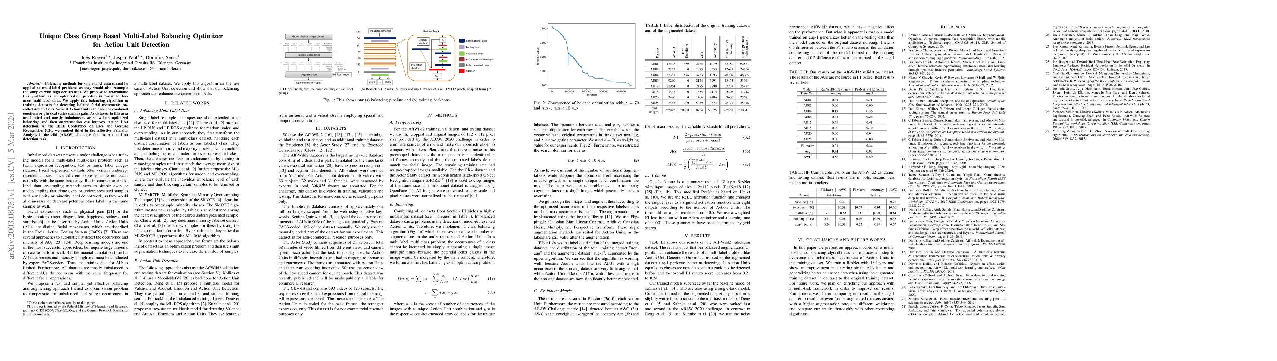 This paper proposes a unique class group-based multi-label balancing optimizer to address the imbalanced nature of multi-label datasets, specifically for detecting Action Units in facial movements. The method improves detection performance through optimized balancing and augmentation, achieving third place in the Affective Behavior Analysis in-the-wild (ABAW) challenge at the IEEE Conference on Face and Gesture Recognition 2020.