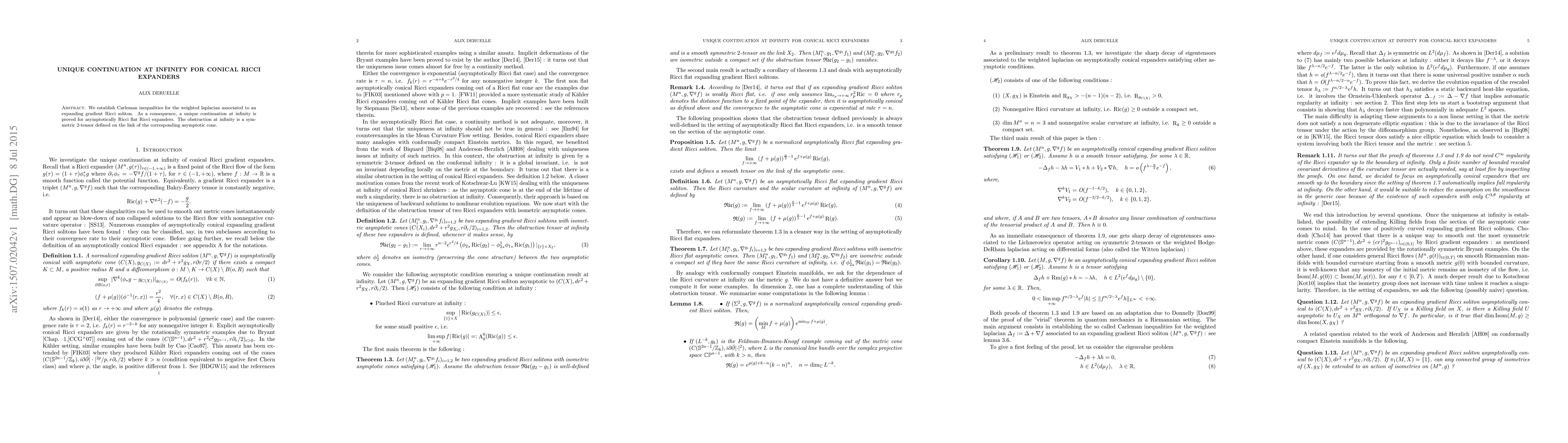 This paper establishes Carleman inequalities for the weighted Laplacian on expanding gradient Ricci solitons, leading to unique continuation at infinity for asymptotically Ricci flat Ricci expanders, with the obstruction at infinity characterized by a symmetric 2-tensor on the link of the asymptotic cone.