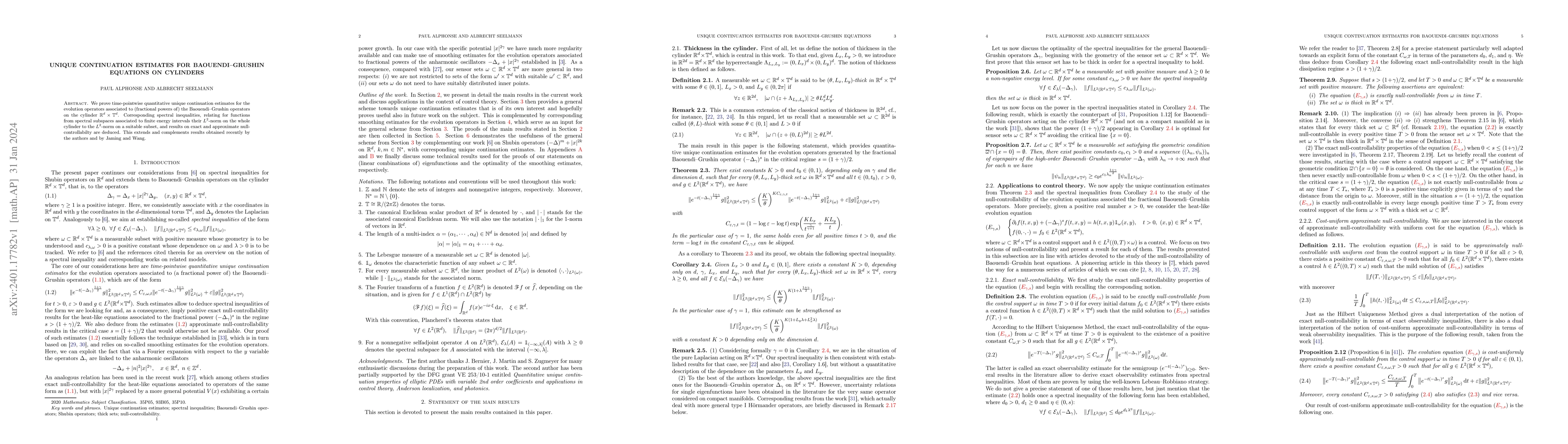 This paper establishes time-pointwise unique continuation estimates for Baouendi-Grushin operators on cylindrical domains, extending previous results. It also derives spectral inequalities and discusses implications for null-controllability.