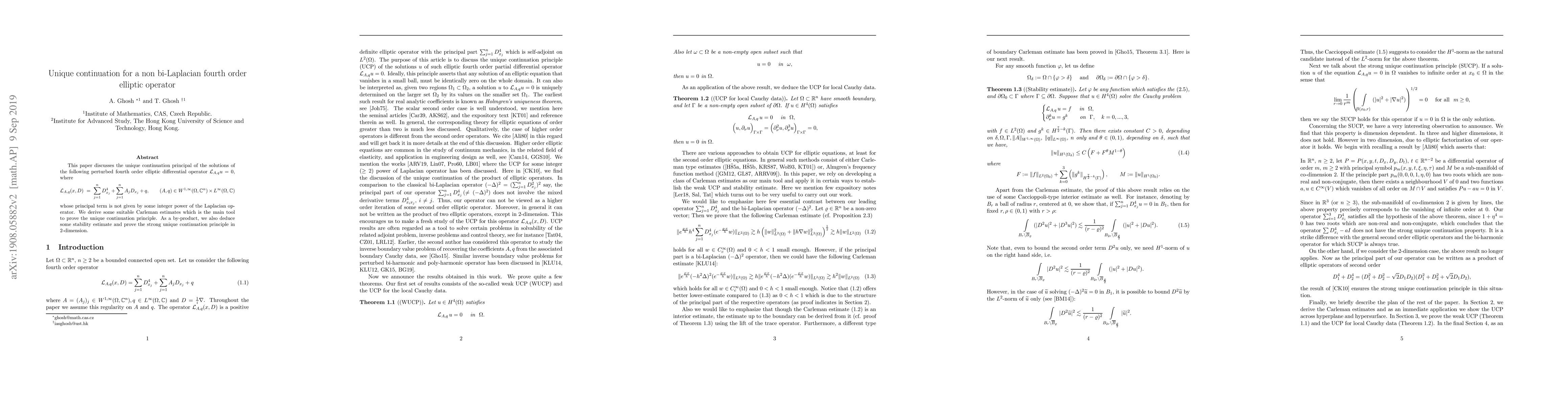 This paper explores the unique continuation principle for solutions of a non-bi-Laplacian fourth-order elliptic operator $\mathcal{L}_{A,q}u=0$, deriving Carleman estimates to prove the principle and establishing strong unique continuation in 2D. Additionally, stability estimates are deduced as a by-product.