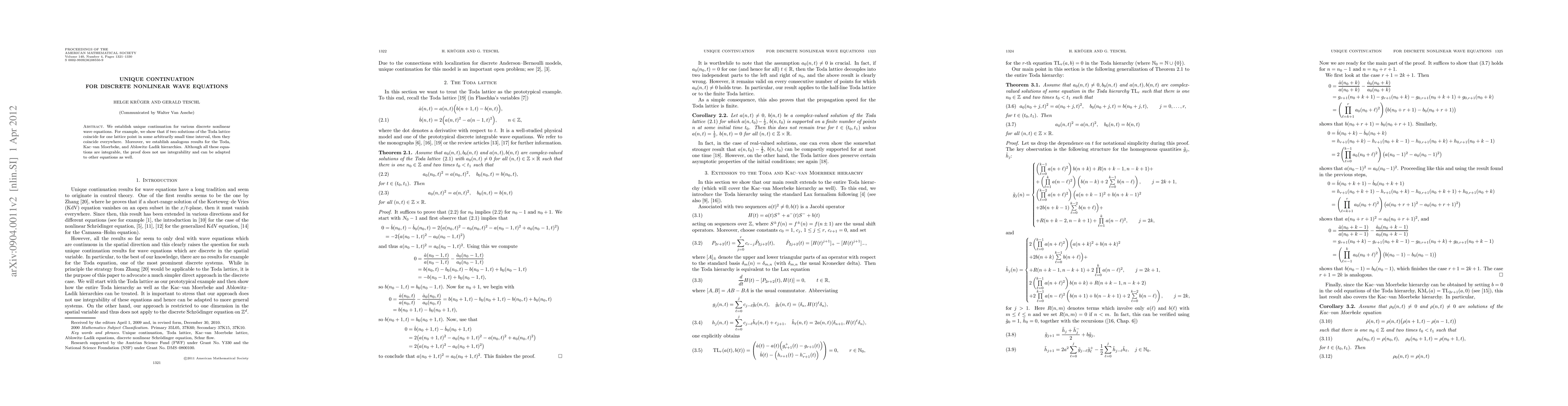 We establish unique continuation for various discrete nonlinear wave equations. For example, we show that if two solutions of the Toda lattice coincide for one lattice point in some arbitrarily small time interval, then they coincide everywhere. Moreover, we establish analogous results for the Toda, Kac-van Moerbeke, and Ablowitz-Ladik hierarchies. Although all these equations are integrable, the proof does not use integrability and can be adapted to other equations as well.