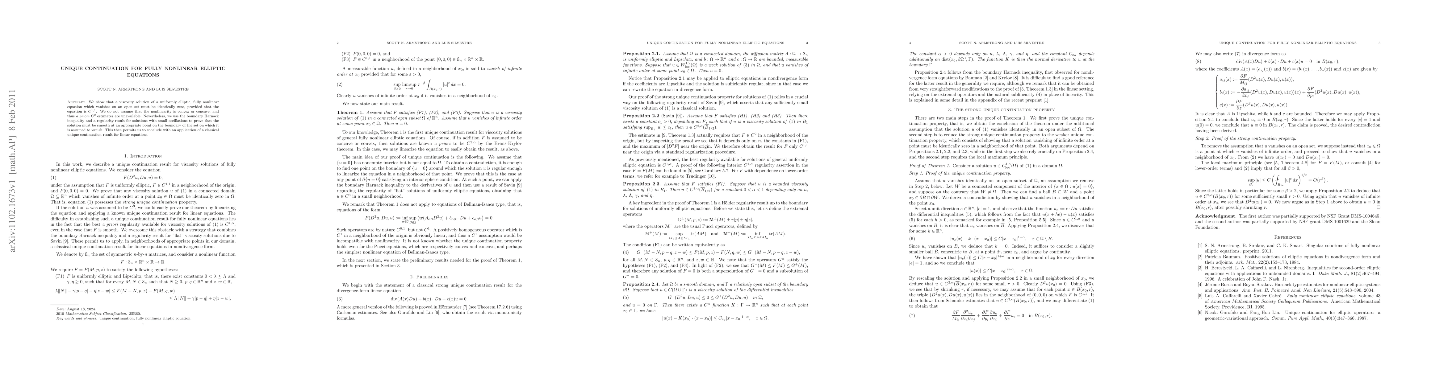 We show that a viscosity solution of a uniformly elliptic, fully nonlinear equation which vanishes on an open set must be identically zero, provided that the equation is $C^{1,1}$. We do not assume that the nonlinearity is convex or concave, and thus \emph{a priori} $C^2$ estimates are unavailable. Nevertheless, we use the boundary Harnack inequality and a regularity result for solutions with small oscillations to prove that the solution must be smooth at an appropriate point on the boundary of the set on which it is assumed to vanish. This then permits us to conclude with an application of a classical unique continuation result for linear equations.