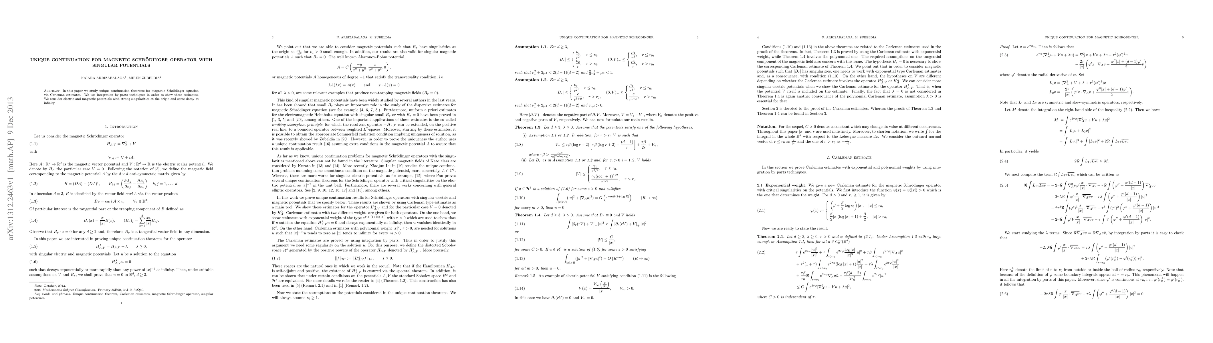 This paper investigates unique continuation theorems for magnetic Schrödinger equations using Carleman estimates and integration by parts techniques. It focuses on electric and magnetic potentials that exhibit strong singularities at the origin and decay at infinity.