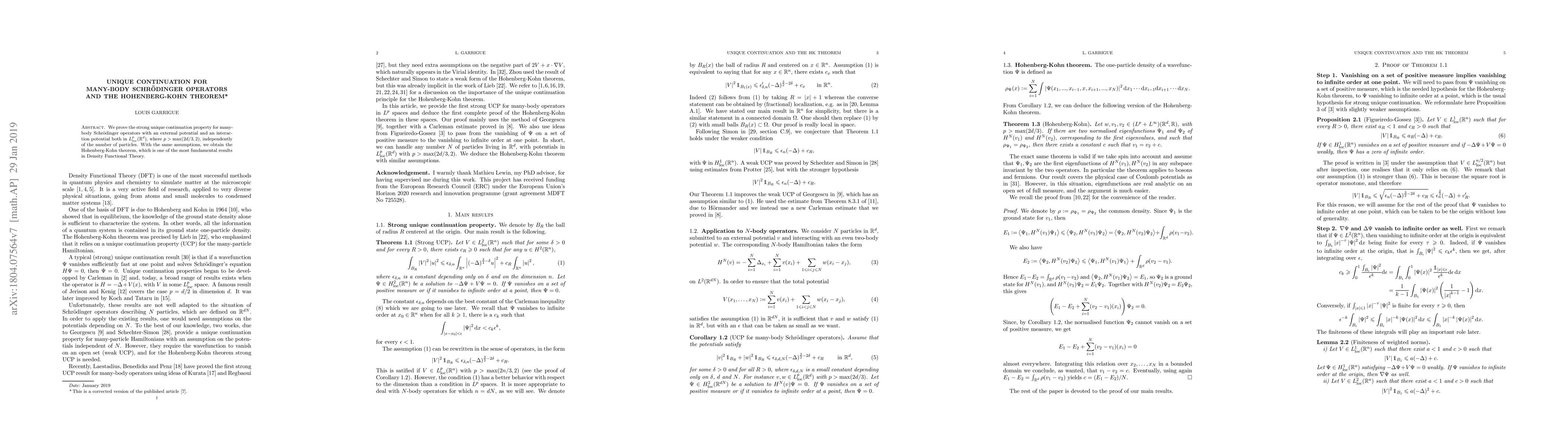 This research paper proves a unique continuation property for many-body Schr"odinger operators, which has significant implications for Density Functional Theory, including the Hohenberg-Kohn theorem, with no dependence on the number of particles.