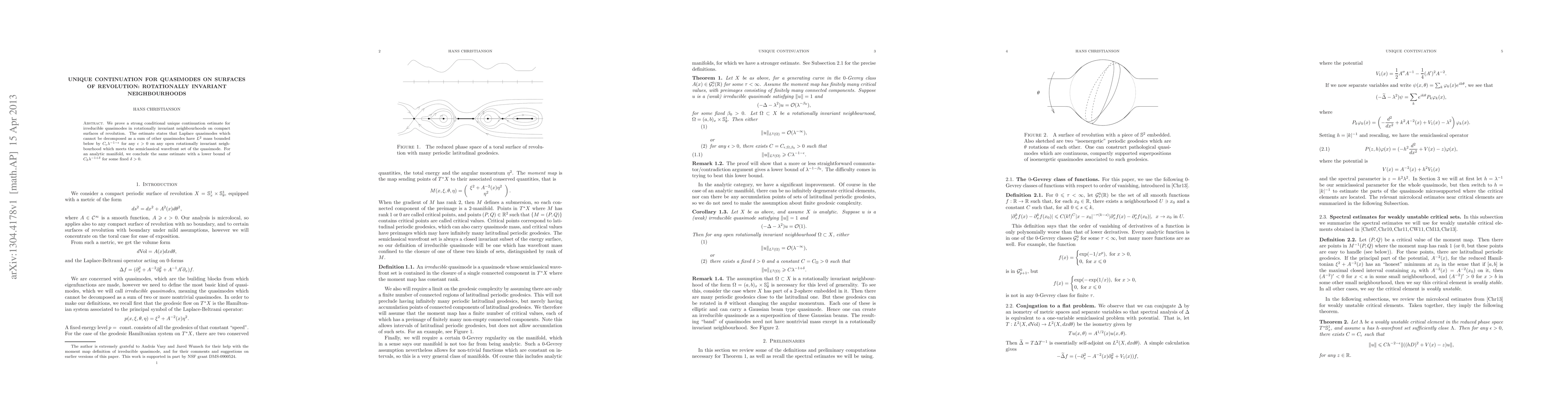 We prove a strong conditional unique continuation estimate for irreducible quasimodes in rotationally invariant neighbourhoods on compact surfaces of revolution. The estimate states that Laplace quasimodes which cannot be decomposed as a sum of other quasimodes have $L^2$ mass bounded below by $C_\epsilon \lambda^{-1 - \epsilon}$ for any $\epsilon>0$ on any open rotationally invariant neighbourhood which meets the semiclassical wavefront set of the quasimode. For an analytic manifold, we conclude the same estimate with a lower bound of $C_\delta \lambda^{-1 + \delta}$ for some fixed $\delta>0$.