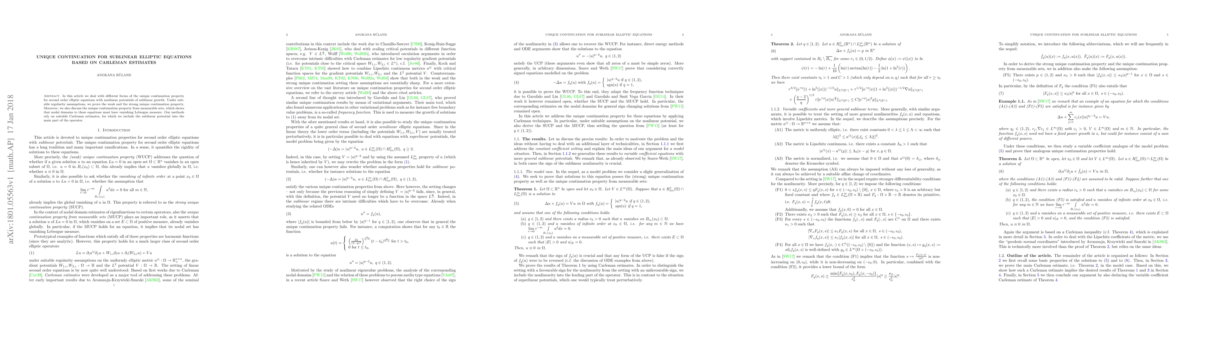 In this article we deal with different forms of the unique continuation property for second order elliptic equations with nonlinear potentials of sublinear growth. Under suitable regularity assumptions, we prove the weak and the strong unique continuation property. Moreover, we also discuss the unique continuation property from measurable sets, which shows that nodal domains to these equations must have vanishing Lebesgue measure. Our methods rely on suitable Carleman estimates, for which we include the sublinear potential into the main part of the operator.