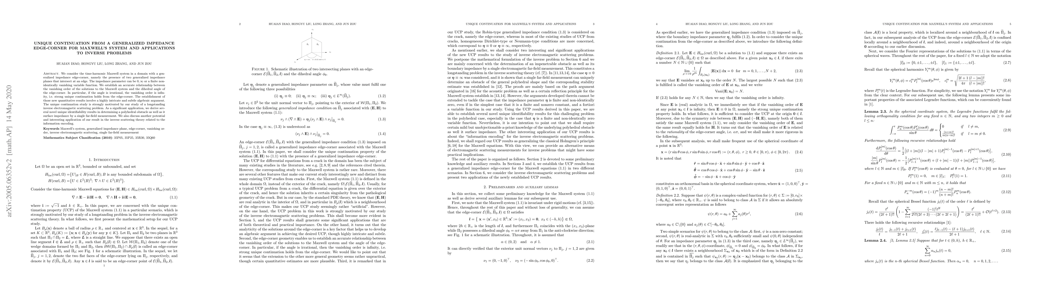 We consider the time-harmonic Maxwell system in a domain with a generalized impedance edge-corner, namely the presence of two generalized impedance planes that intersect at an edge. The impedance parameter can be $0, \infty$ or a finite non-identically vanishing variable function. We establish an accurate relationship between the vanishing order of the solutions to the Maxwell system and the dihedral angle of the edge-corner. In particular, if the angle is irrational, the vanishing order is infinity, i.e. strong unique continuation holds from the edge-corner. The establishment of those new quantitative results involve a highly intricate and subtle algebraic argument. The unique continuation study is strongly motivated by our study of a longstanding inverse electromagnetic scattering problem. As a significant application, we derive several novel unique identifiability results in determining a polyhedral obstacle as well as it surface impedance by a single far-field measurement. We also discuss another potential and interesting application of our result in the inverse scattering theory related to the information encoding.