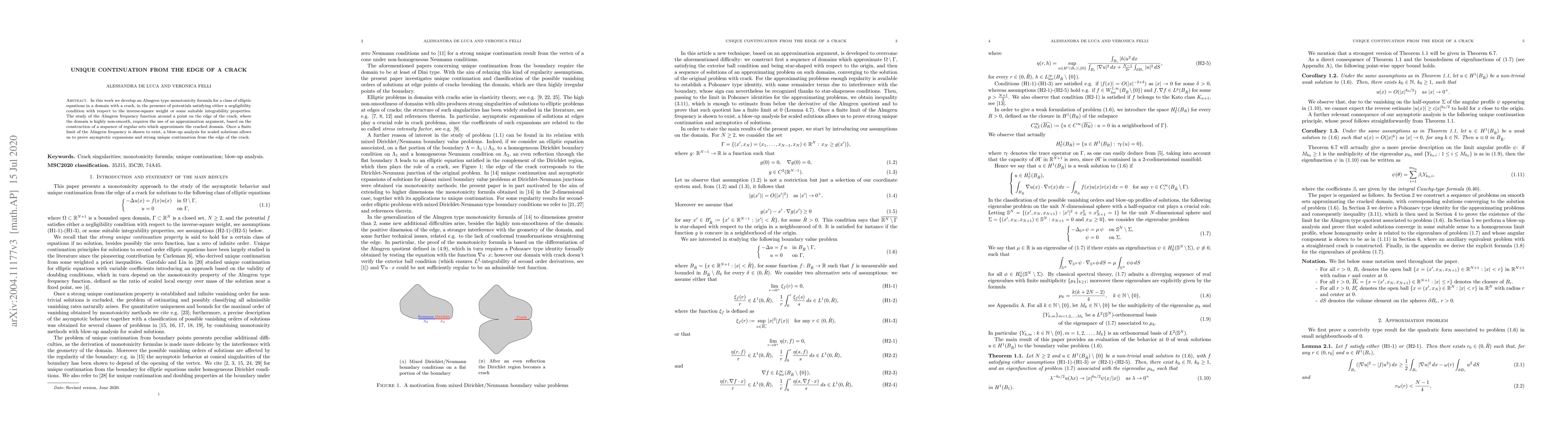 Researchers developed a new mathematical formula to study solutions of elliptic equations with cracks in domains, allowing for unique continuation from the edge of the crack under certain conditions.
