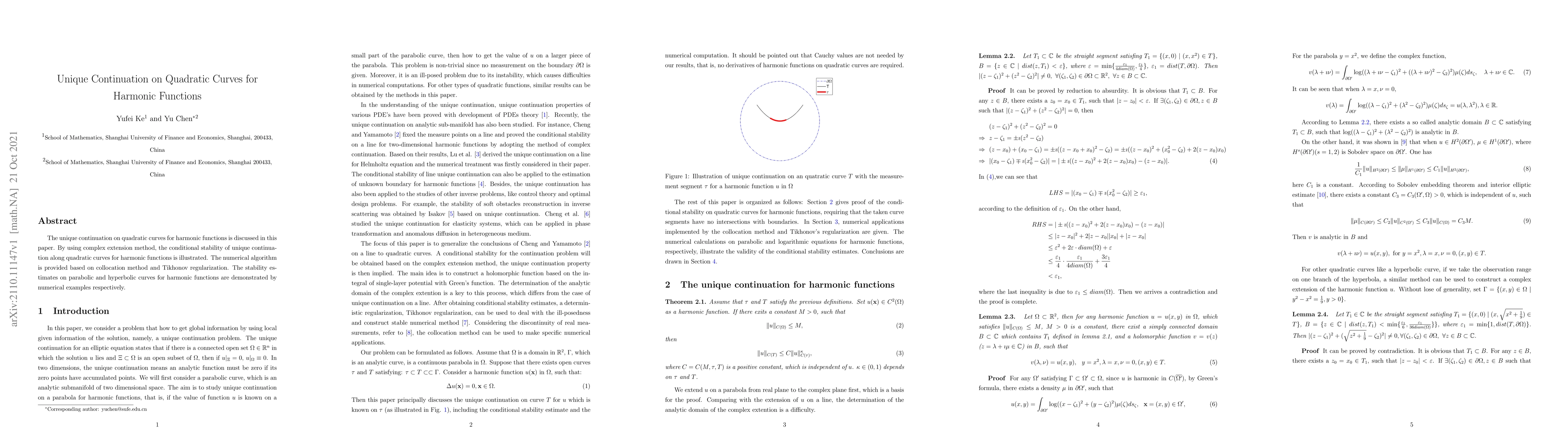 This paper explores the unique continuation of harmonic functions along quadratic curves, employing a complex extension method to demonstrate conditional stability. It presents a numerical algorithm based on collocation and Tikhonov regularization, with numerical examples illustrating stability estimates for parabolic and hyperbolic curves.