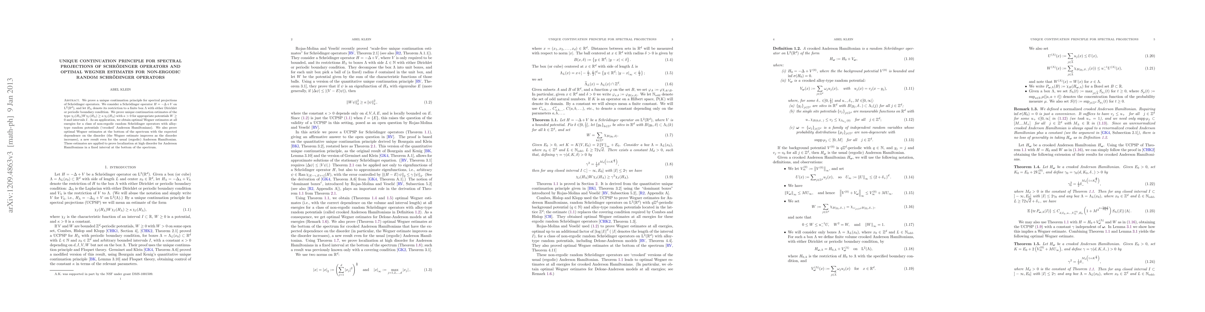 We prove a unique continuation principle for spectral projections of Schr\" odinger operators. We consider a Schr\" odinger operator $H= -\Delta + V$ on $\mathrm{L}^2(\mathbb{R}^d)$, and let $H_{\Lambda}$ denote its restriction to a finite box $\Lambda$ with either Dirichlet or periodic boundary condition. We prove unique continuation estimates of the type $\chi_I (H_\Lambda) W \chi_I (H_\Lambda) \ge \kappa\, \chi_I (H_\Lambda) $ with $\kappa >0$ for appropriate potentials $W\ge 0$ and intervals $I$. As an application, we obtain optimal Wegner estimates at all energies for a class of non-ergodic random Schr\" odinger operators with alloy{-type random potentials (`crooked' Anderson Hamiltonians). We also prove optimal Wegner estimates at the bottom of the spectrum with the expected dependence on the disorder (the Wegner estimate improves as the disorder increases), a new result even for the usual (ergodic) Anderson Hamiltonian. These estimates are applied to prove localization at high disorder for Anderson Hamiltonians in a fixed interval at the bottom of the spectrum.