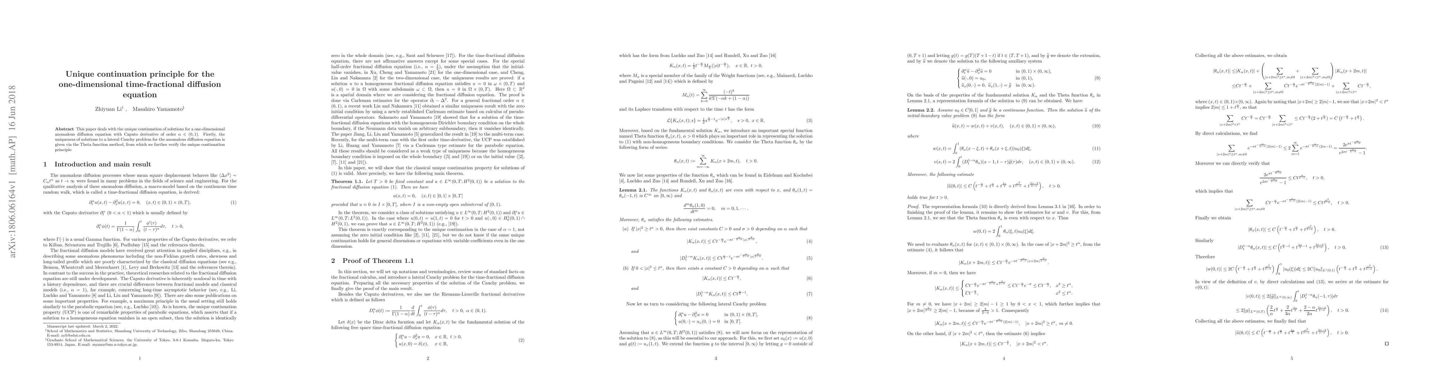 This paper establishes the unique continuation of solutions for a one-dimensional time-fractional diffusion equation using the Theta function method, confirming the principle for anomalous diffusion with Caputo derivatives.